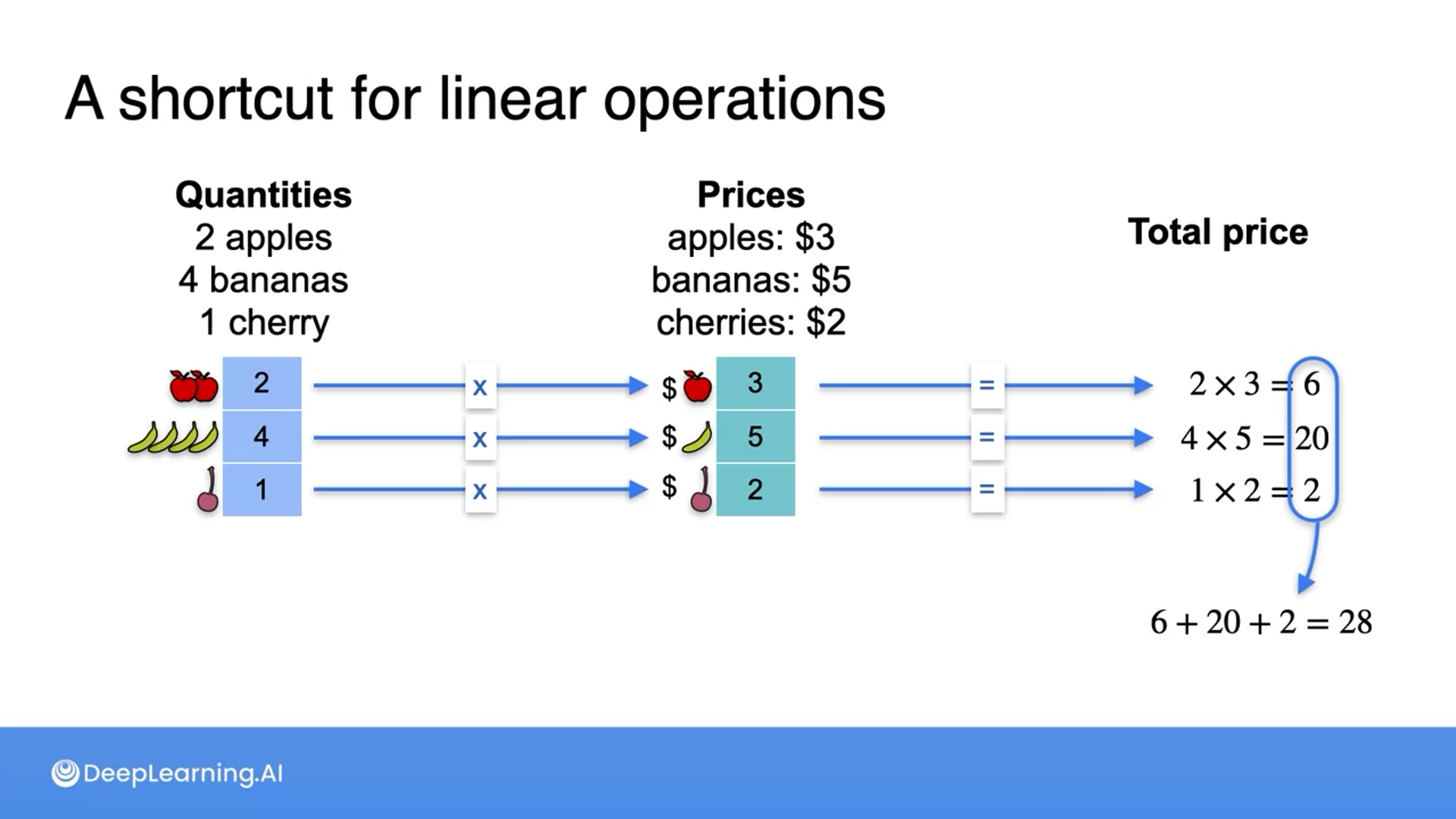 Multiplying a matrix by a vector is similar to a dot product, where we multiply each element of rows by the elements of a vector