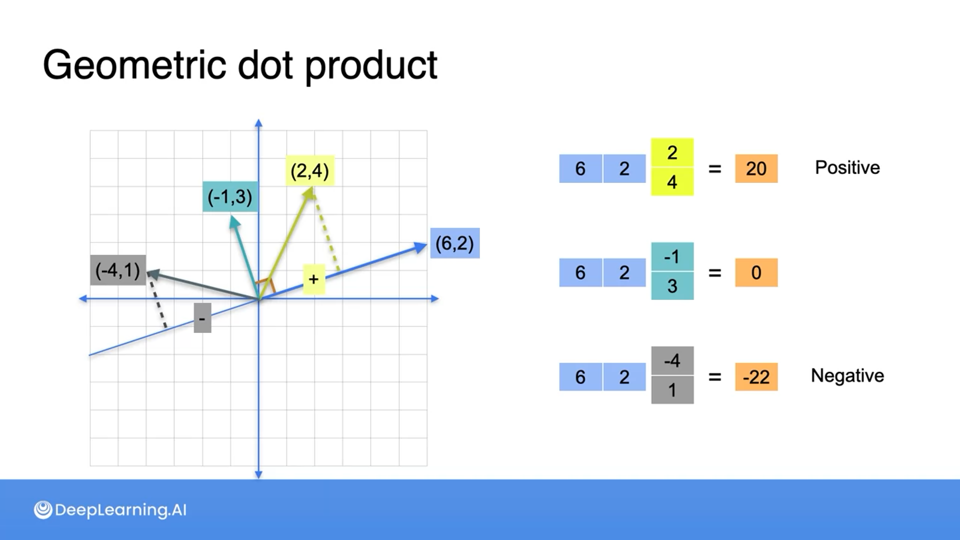 The dot product can be positive, 0, or negative depending on the projected perpendicular vector
