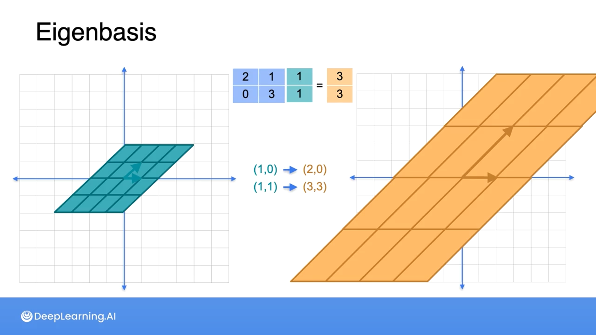 Eigenbasis: A way to stretch one parallelogram to another parallelogram or look at the linear transformation to the basis that sends a parallelogram to another parallelogram