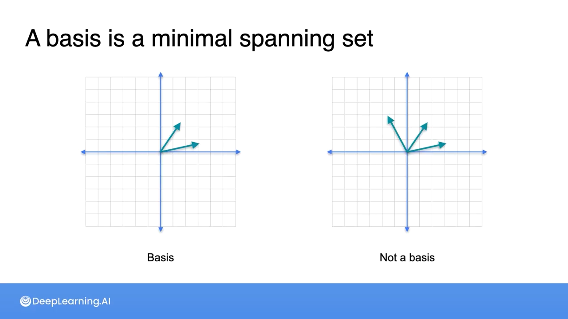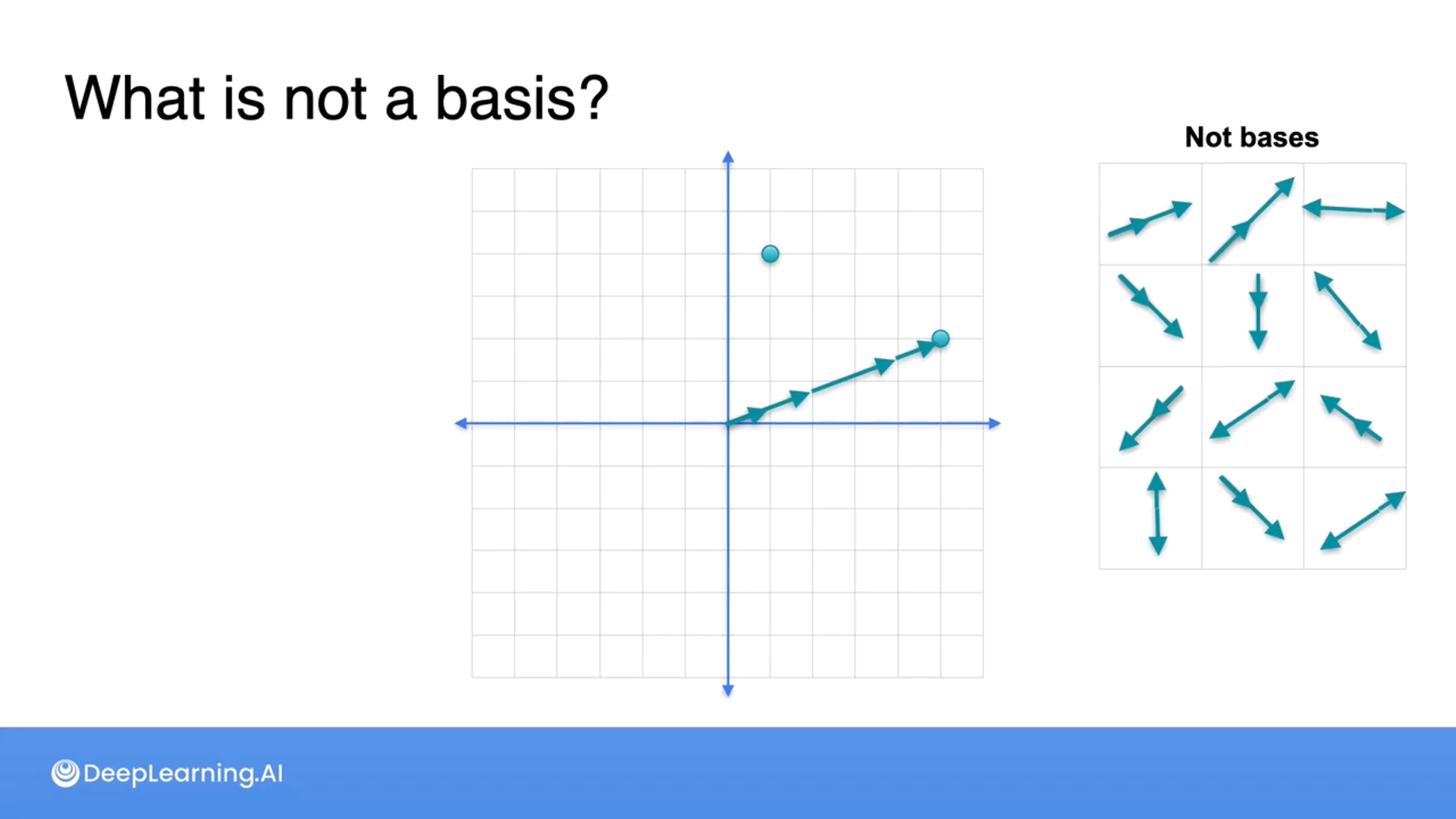 The main property of basis is that every point in the space can be expressed as a linear combination of elements in the bases