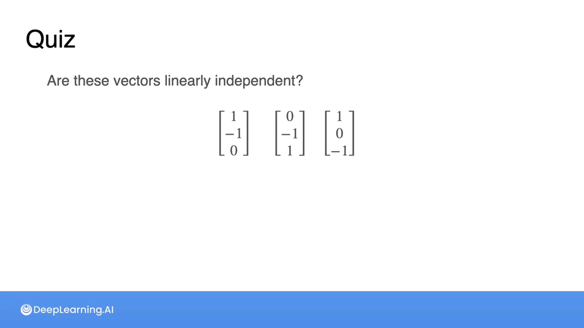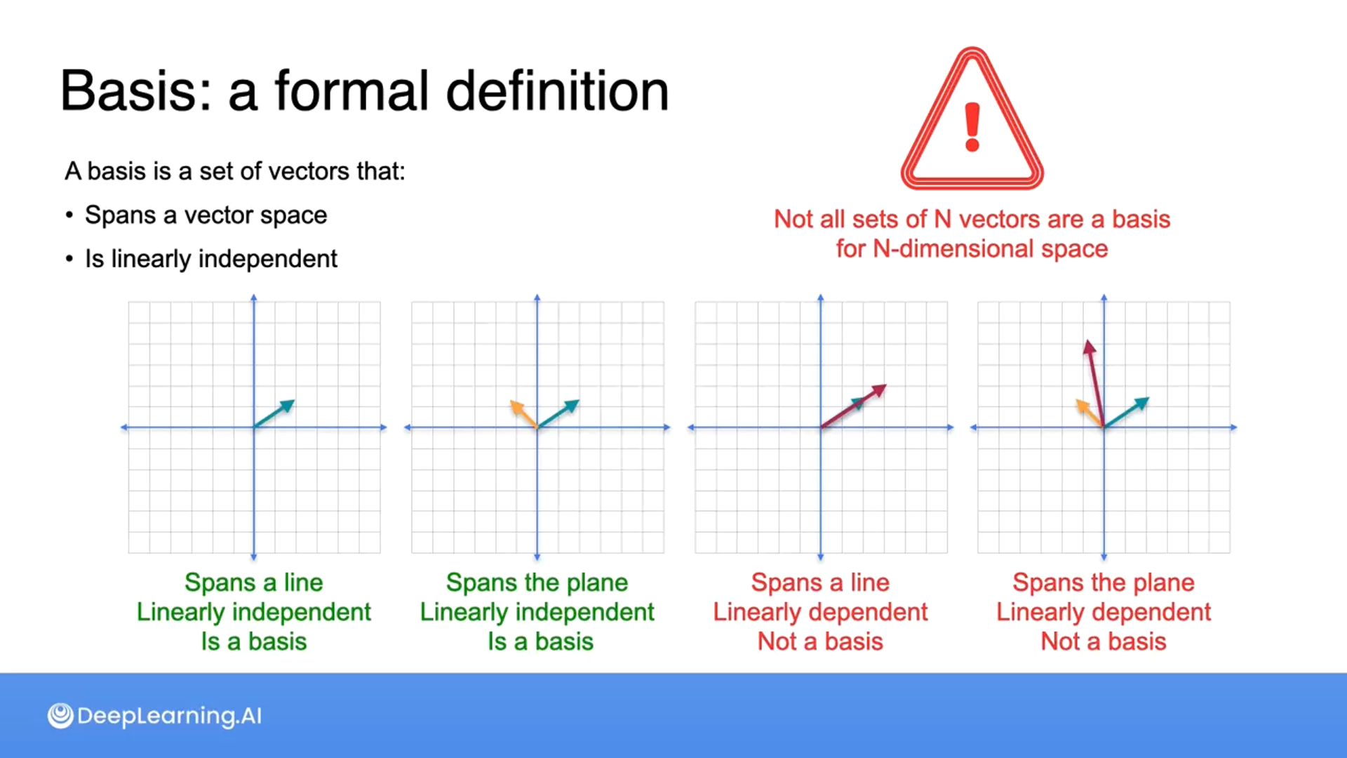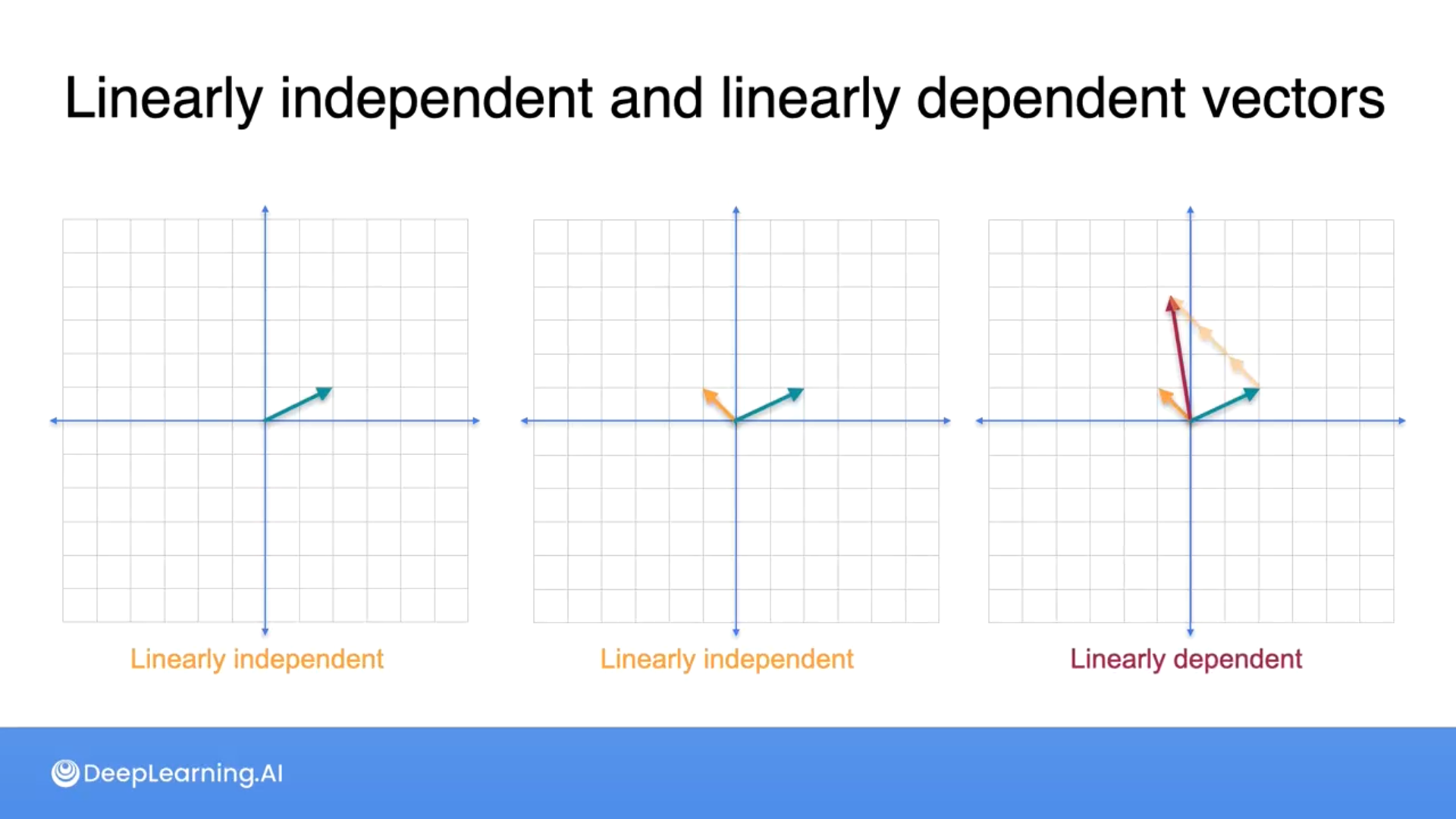 Linearly independent: When one vector can’t be obtained as a linear combination of the others