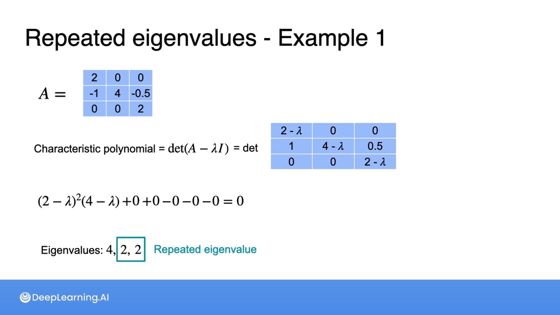 Although it won’t affect the calculation, the matrix of the characteristic polynomial has an error where the elements of the second row should be $[-1, 4-\lambda, -0.5]$ instead of $[1, 4-\lambda, 0.5]$
