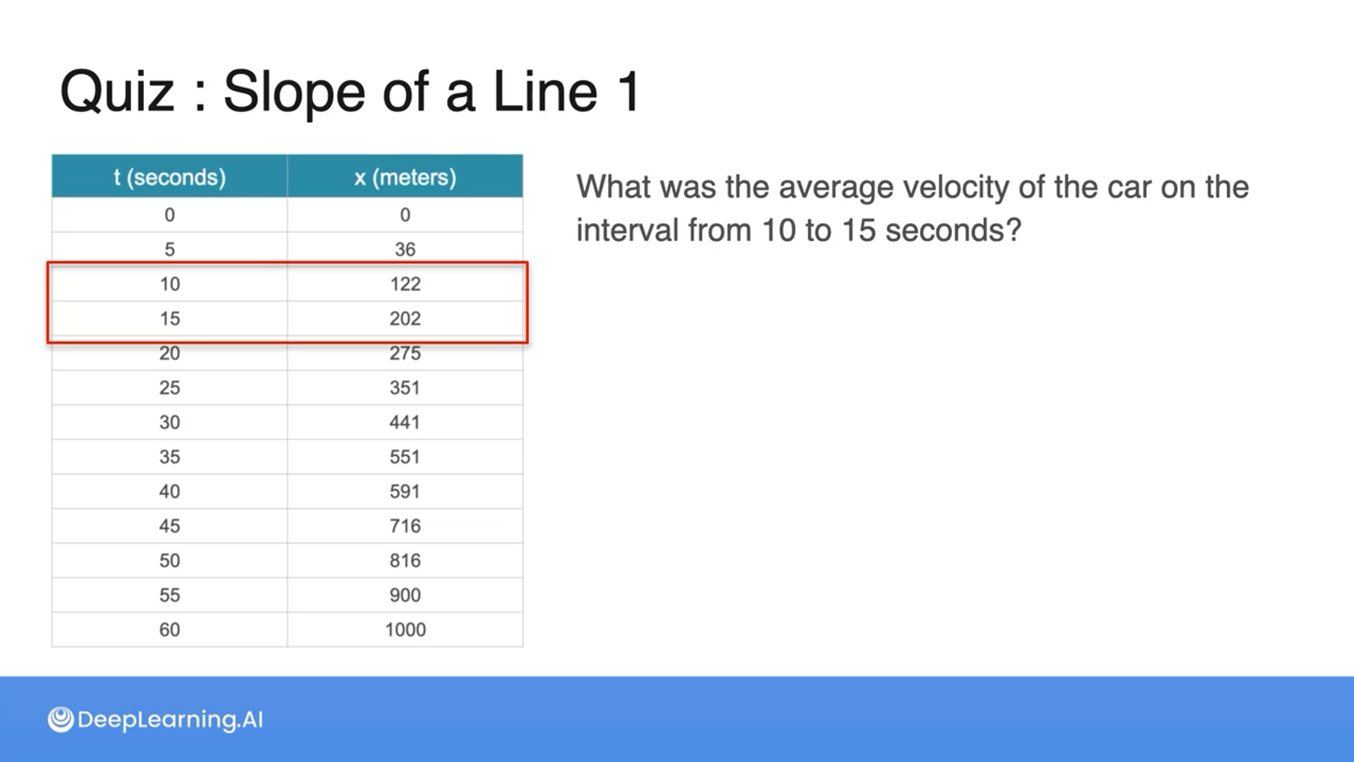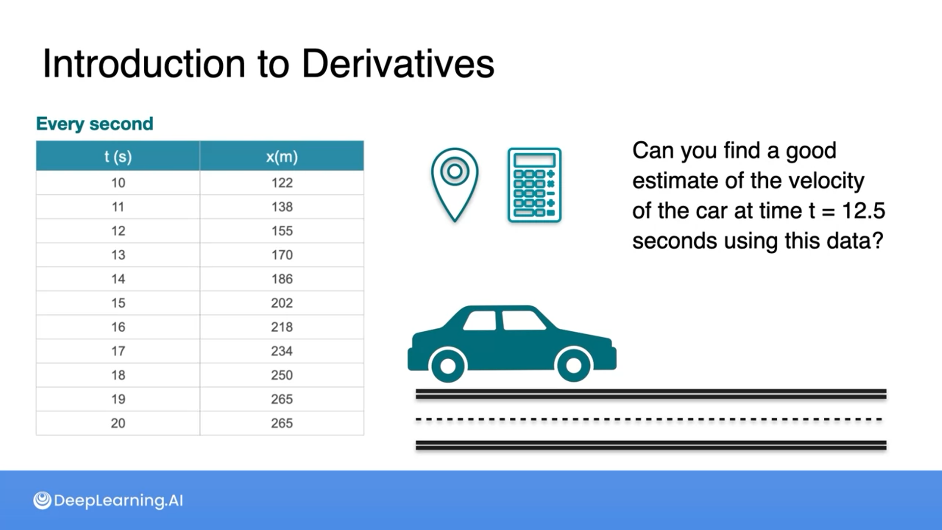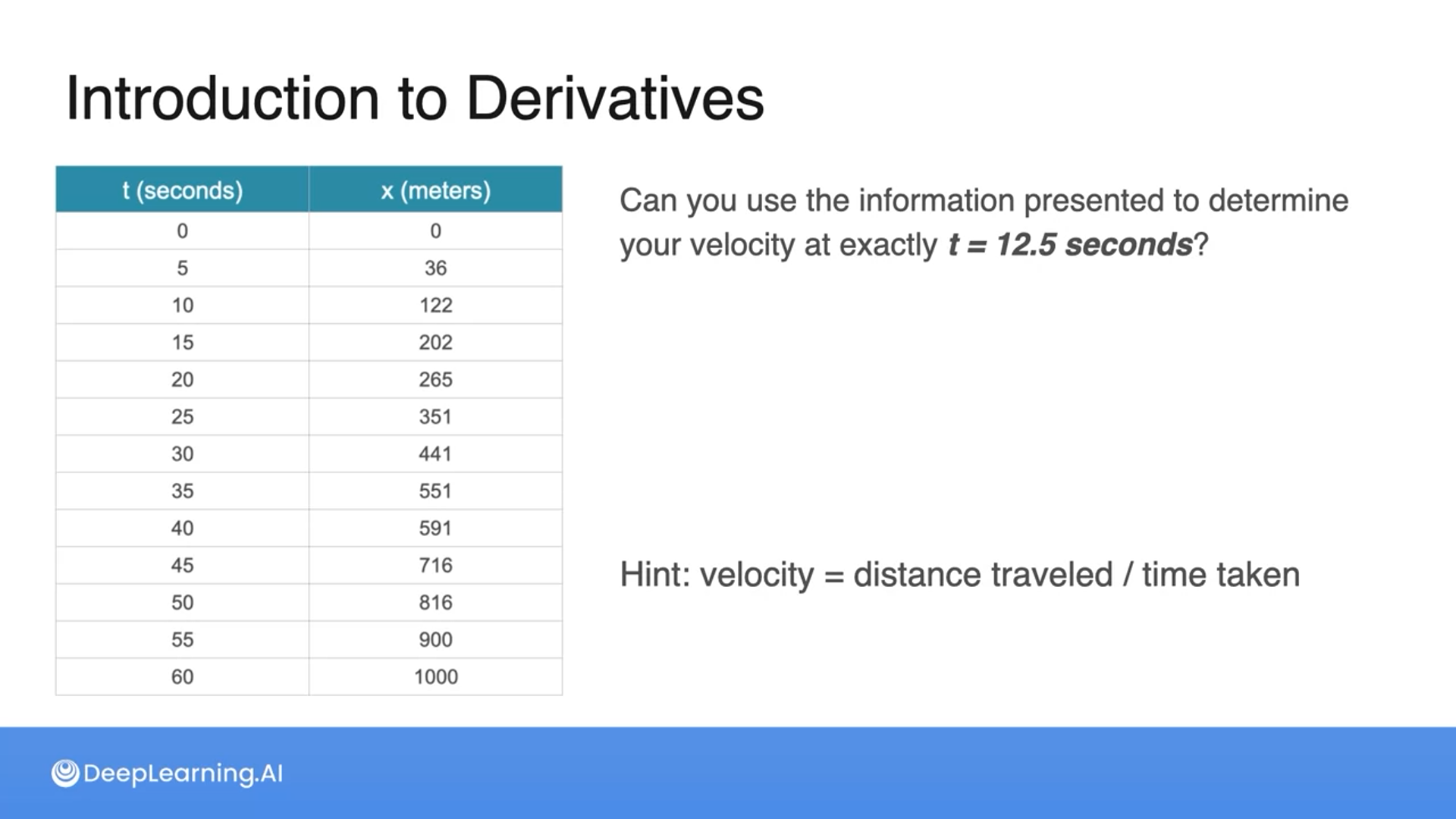 Correct! While you do not have enough data to determine the velocity at t=12.5 seconds, you can only tell the average velocity between 10 and 15!