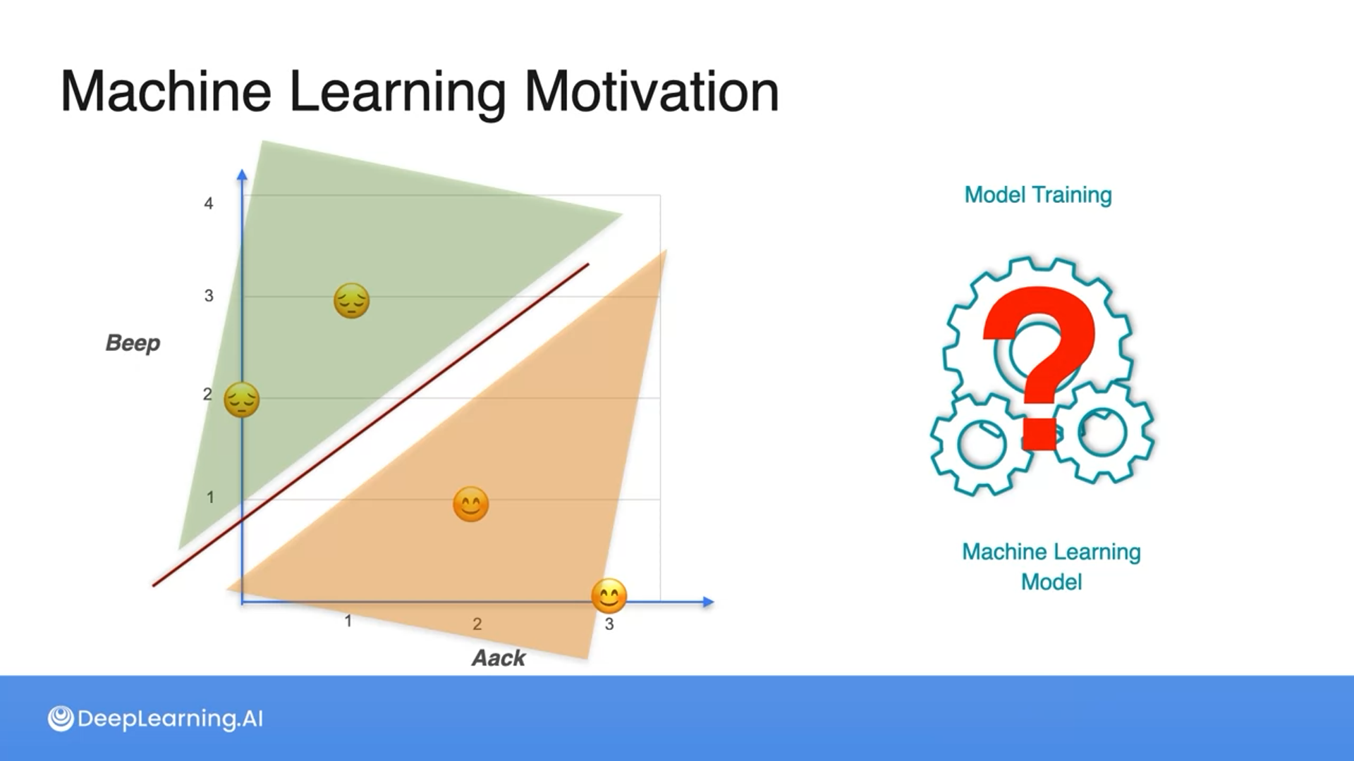 Starts with a random line and then tweaks the line to the most suitable location to either find a best-fitting line that crosses the points (regression problem) or divides the points (classification problem), this process is called optimization.