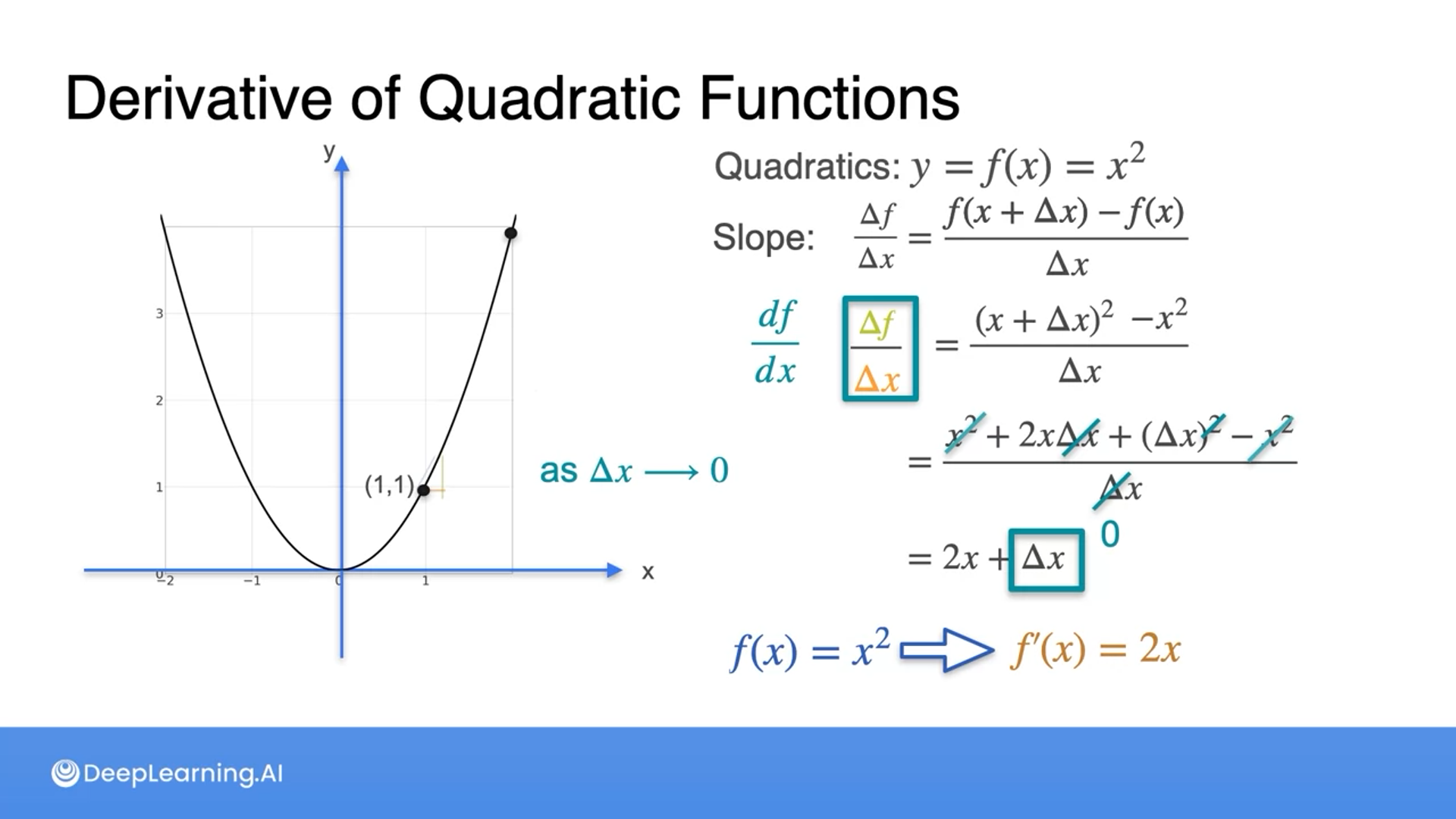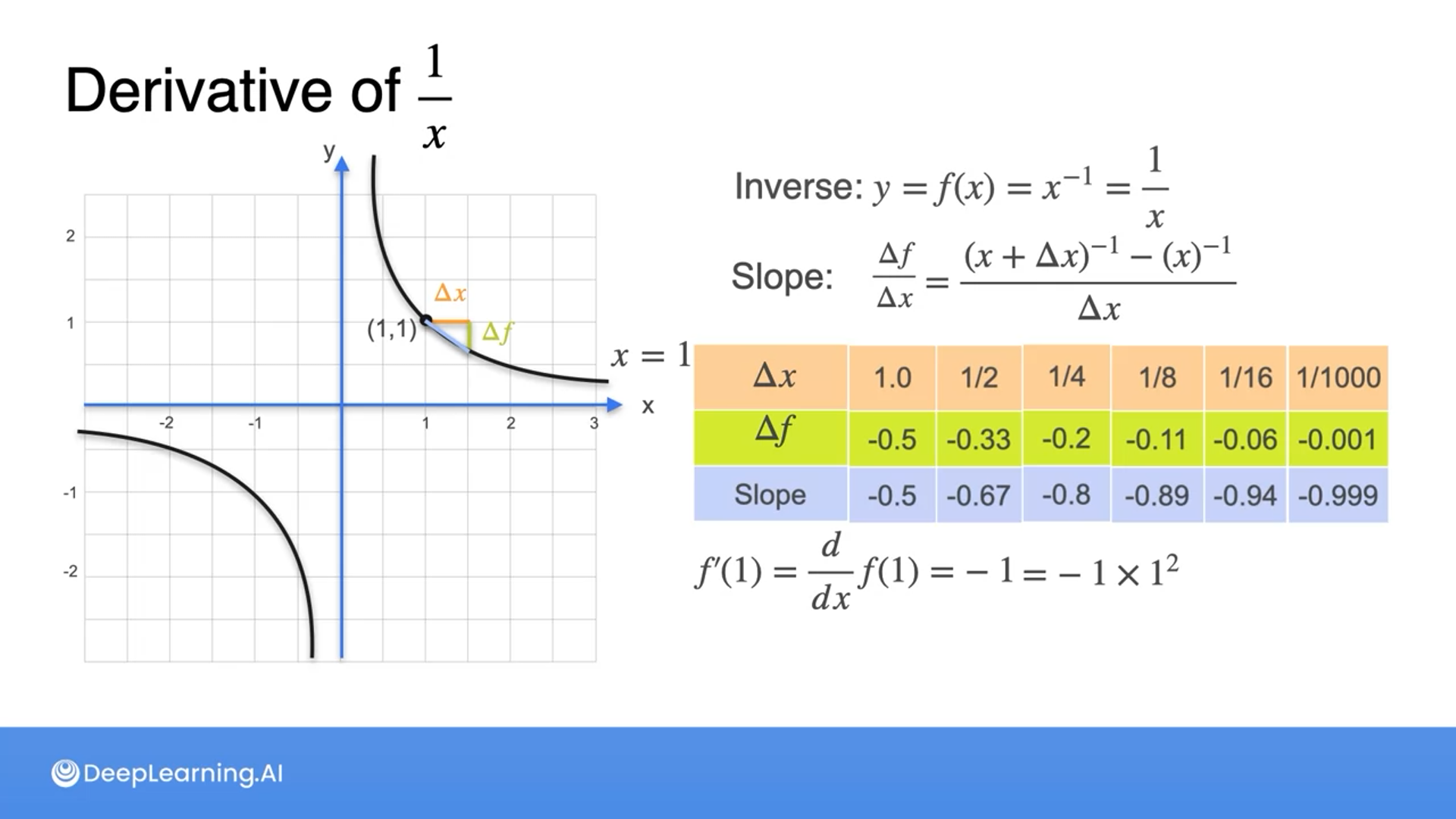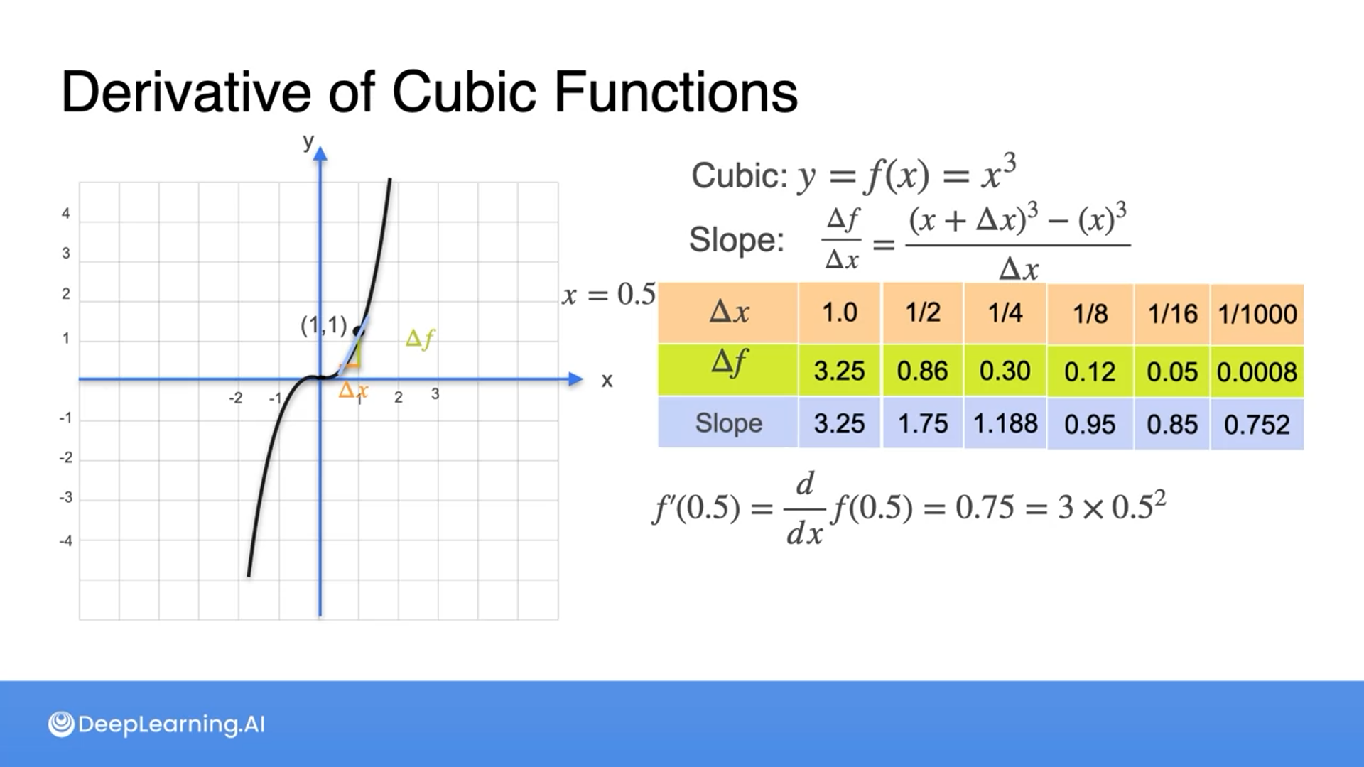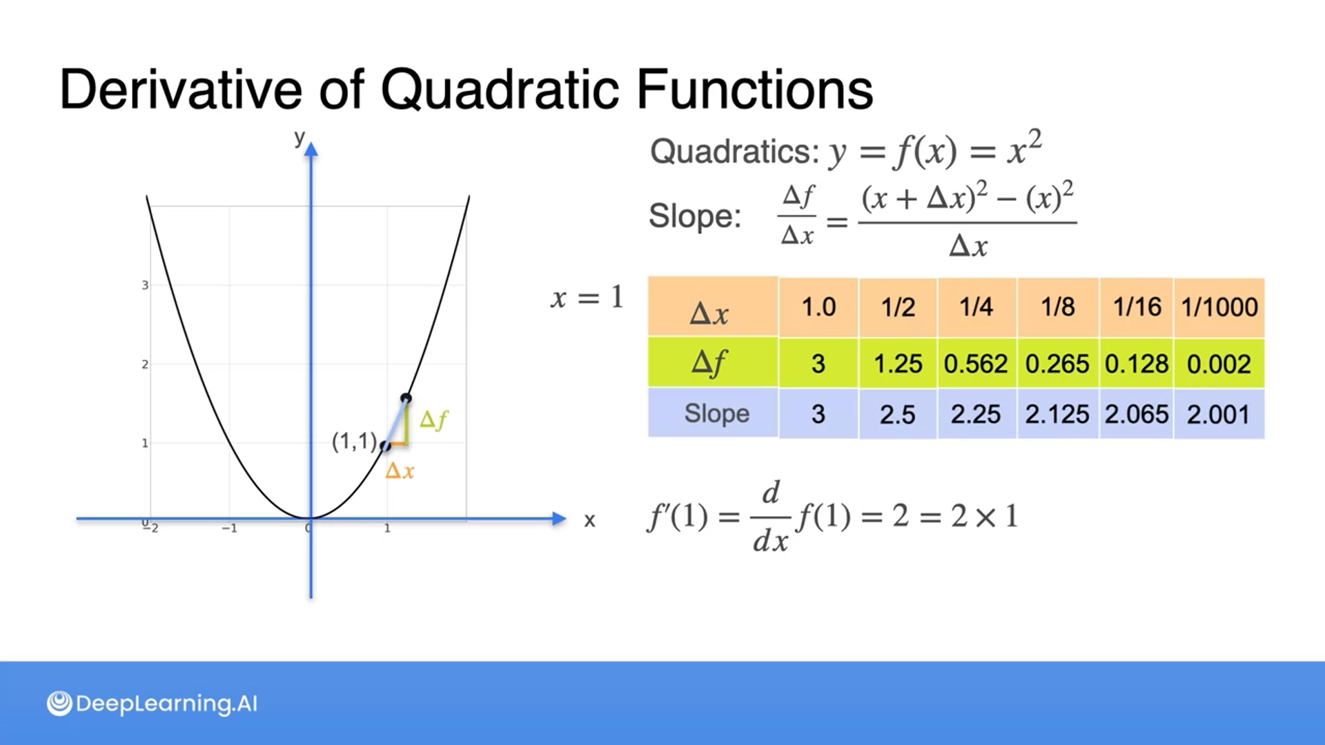 For the above slide, plug in the values for $\Delta x$ (the change in $x$) and $x$, where $x = 1$ to get $\Delta f$ and then the slope