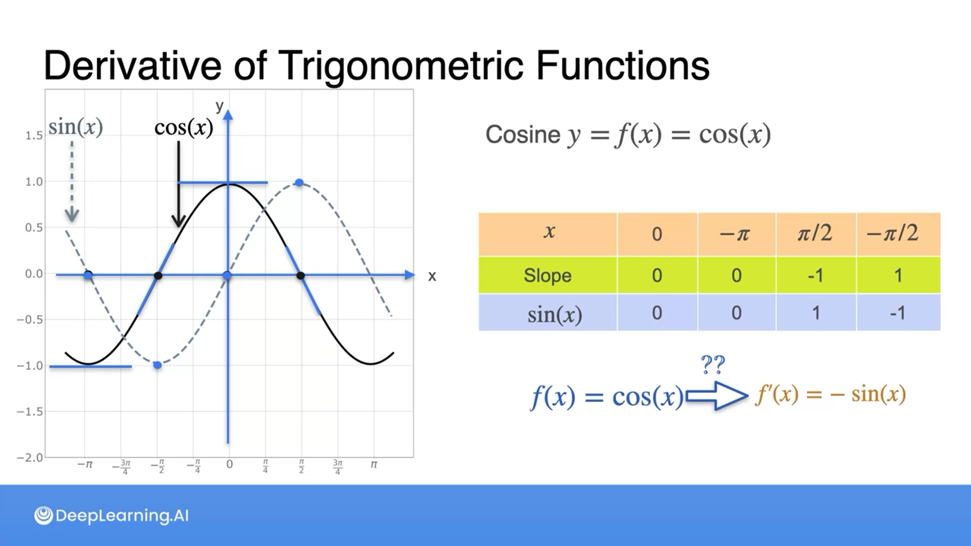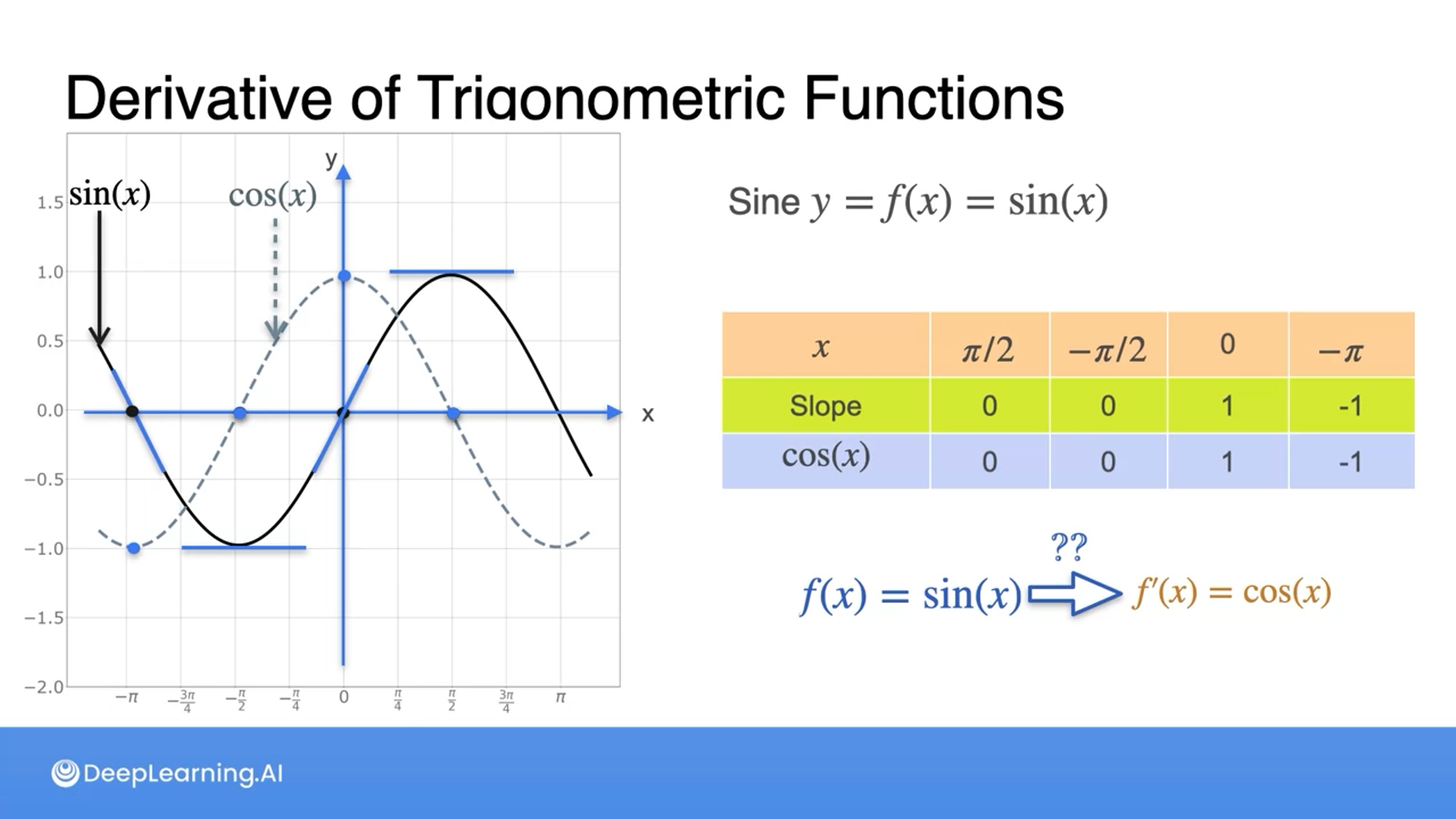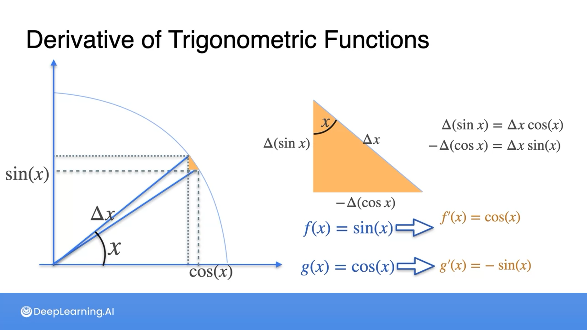 For formal math explanation, refer to [Derivatives of the Trigonometric Functions](https://www.mathsisfun.com/calculus/derivatives-trig-proof.html#:~:text=The%20three%20most%20useful%20derivatives%20in%20trigonometry%20are...,sin%20%28x%29...%20ddx%20tan%20%28x%29%20%3D%20sec2%20%28x%29).
