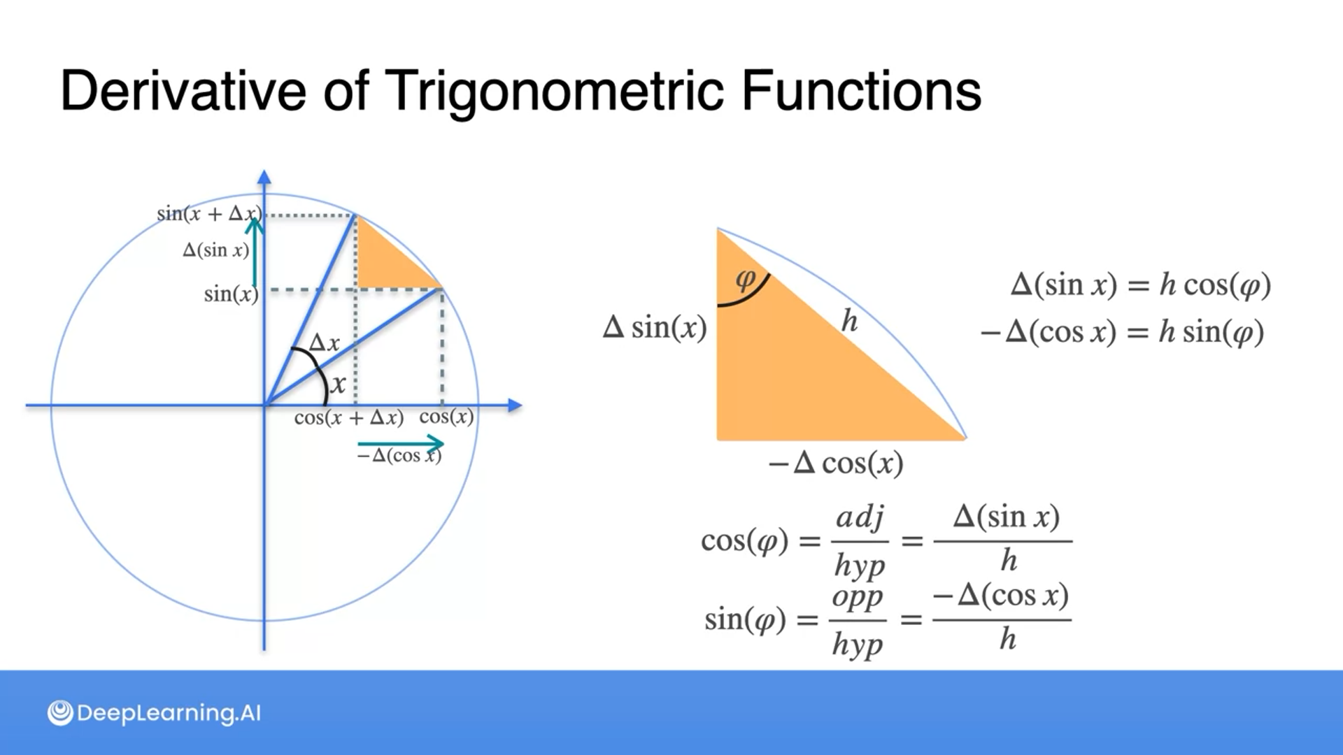 So update the formula and divide both left and right by $\Delta x$, where the left term changes to the derivatives and the right term cancels out the $\Delta x$ that leaves the trigonometric functions.