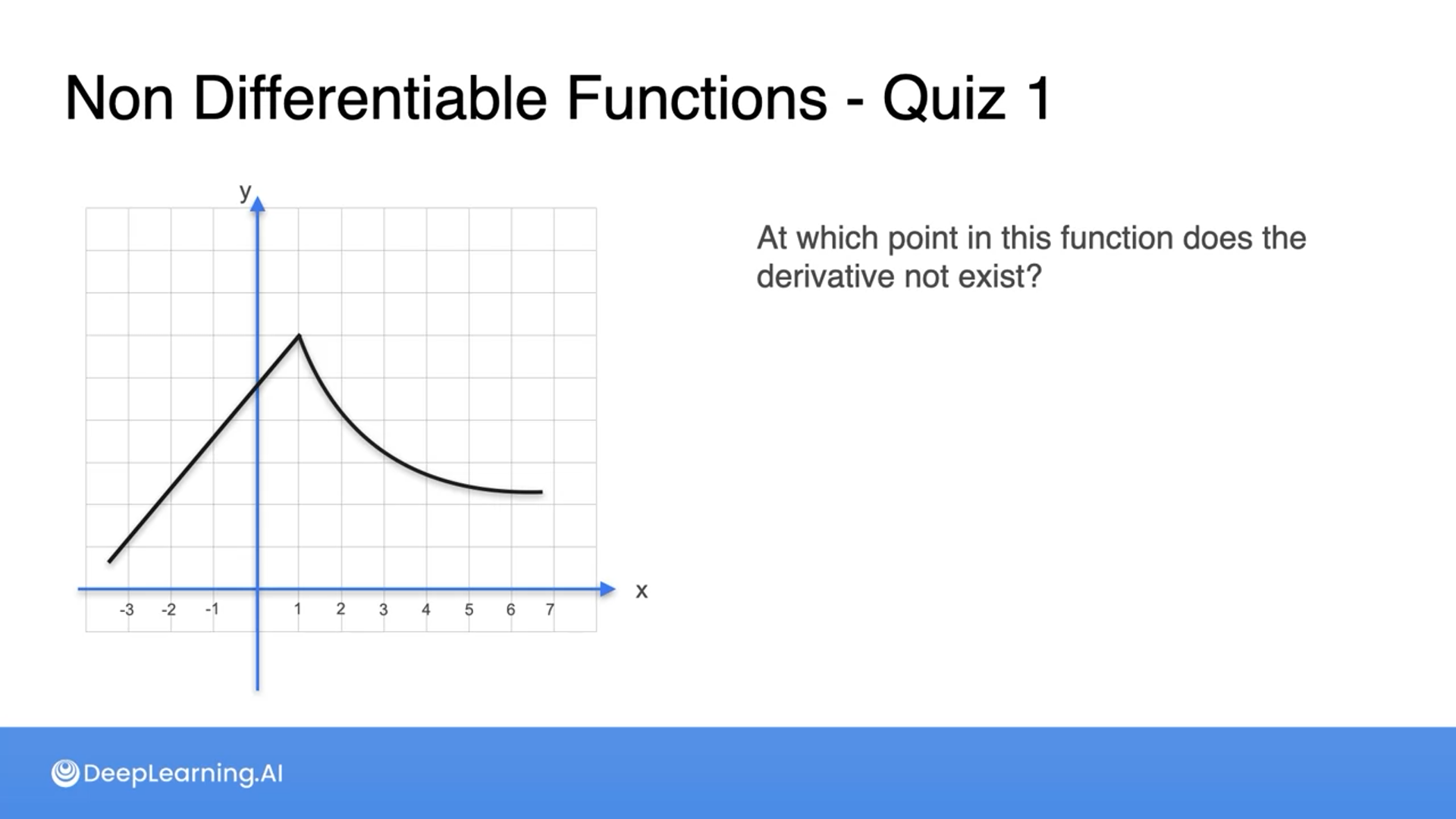 Correct. There is a cusp at x = 1 so the derivative does not exist.