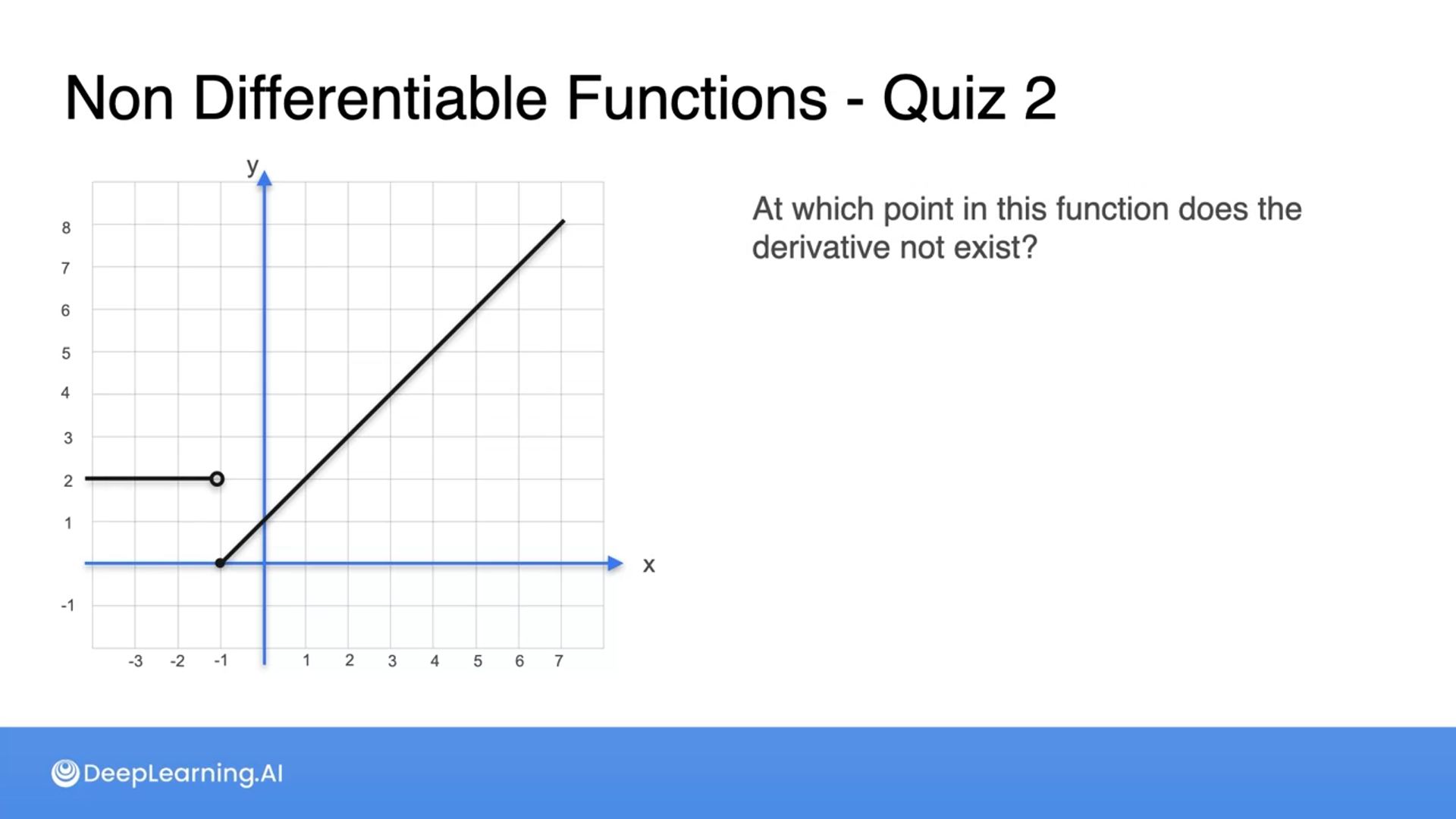 Correct. There is a discontinuity/jump at x=-1, so the derivative does not exist.