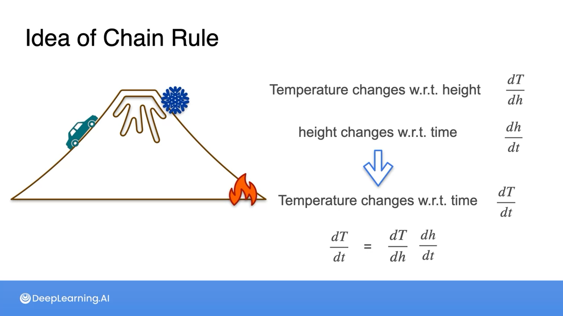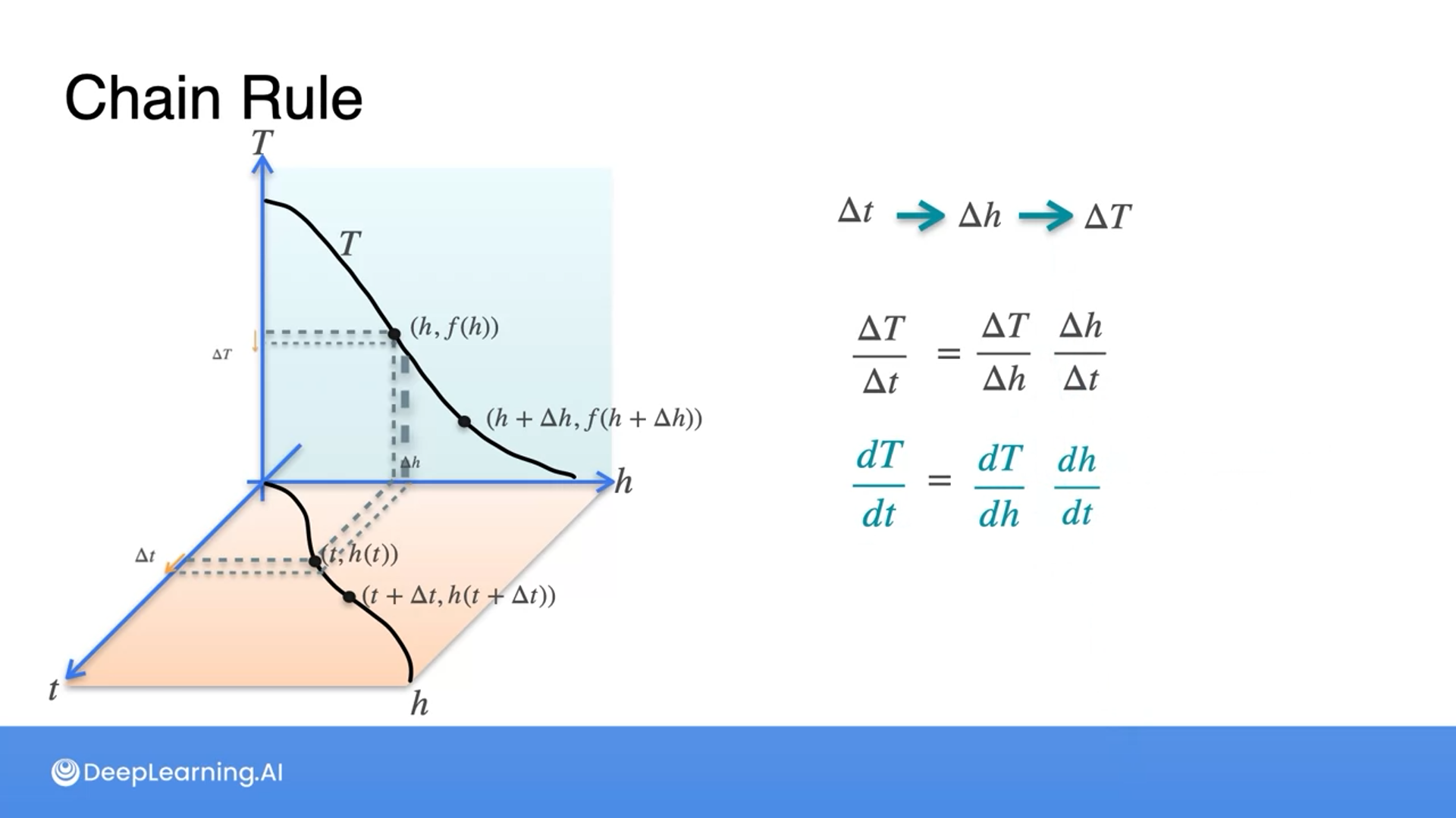 With the above example, the chain rule allows us to find the change in temperature to time if we know the change in height to time and the change in temperature to height.
