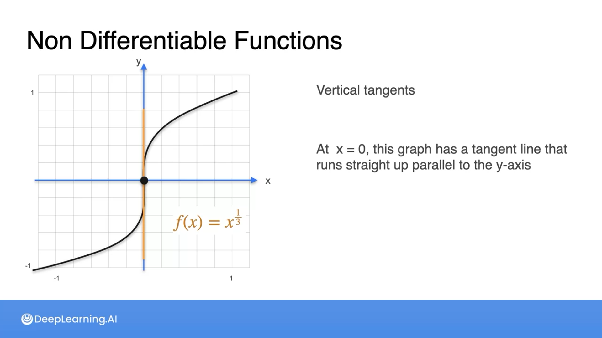 Vertical tangents are not differentiable at the origin (x = 0) because we cannot divide by 0.