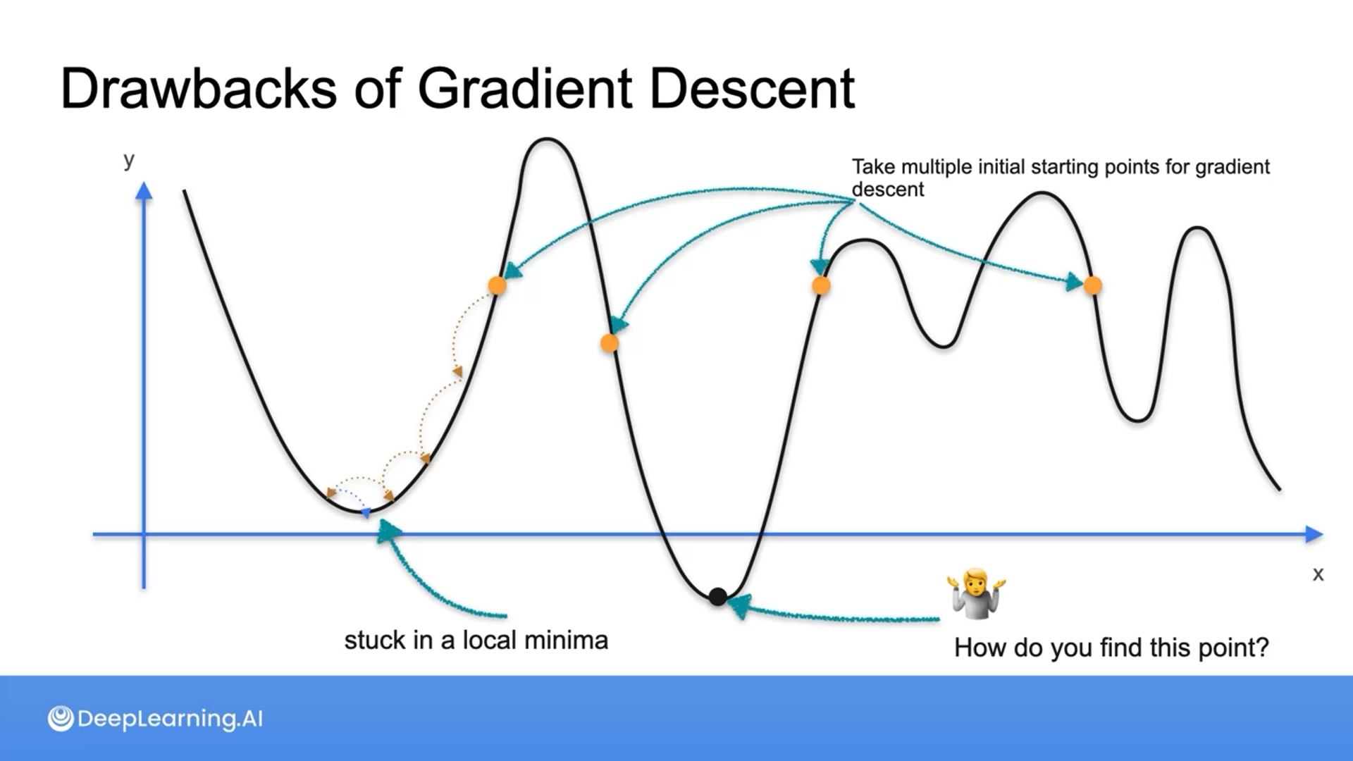 The drawback of the gradient descent is that it moves based on the slope and won’t always find the global minima.