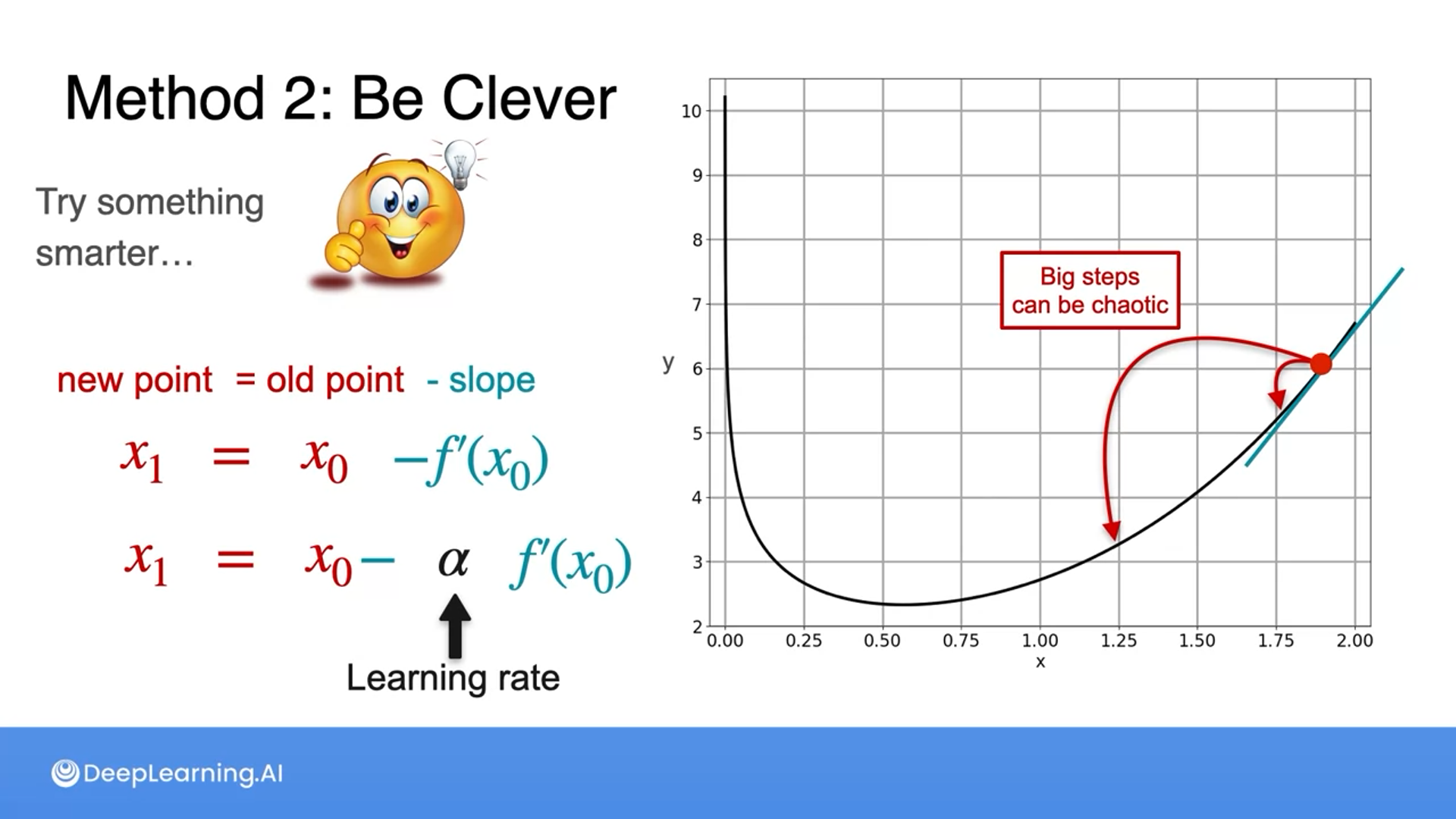 By applying a learning rate, if the slope is big, it can take a large step and if the slope is small, it can take a smaller step.