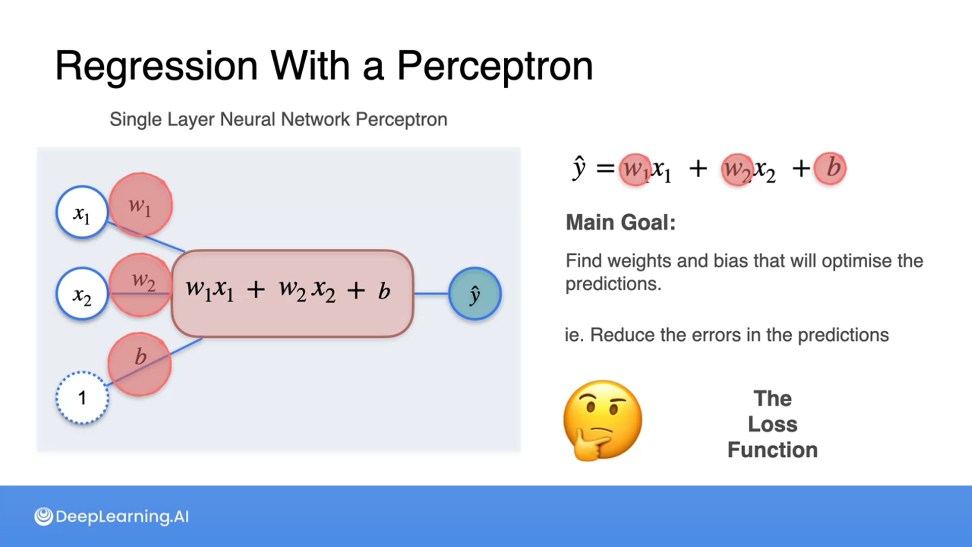 Perceptron can be seen as a linear regression, where inputs are multiplied with weights. We output a prediction using the formula wx + b and optimize the weights (w) and bias (b).
