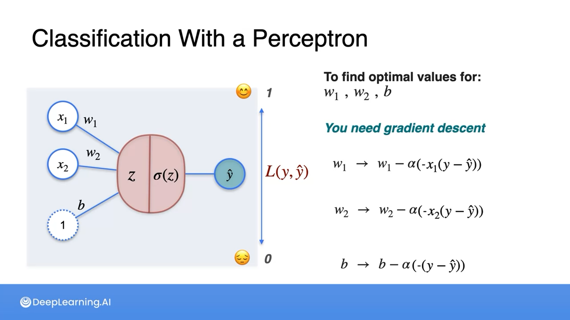 We update the weights and biases to minimize the loss function (log loss) which is done by performing gradient descent.