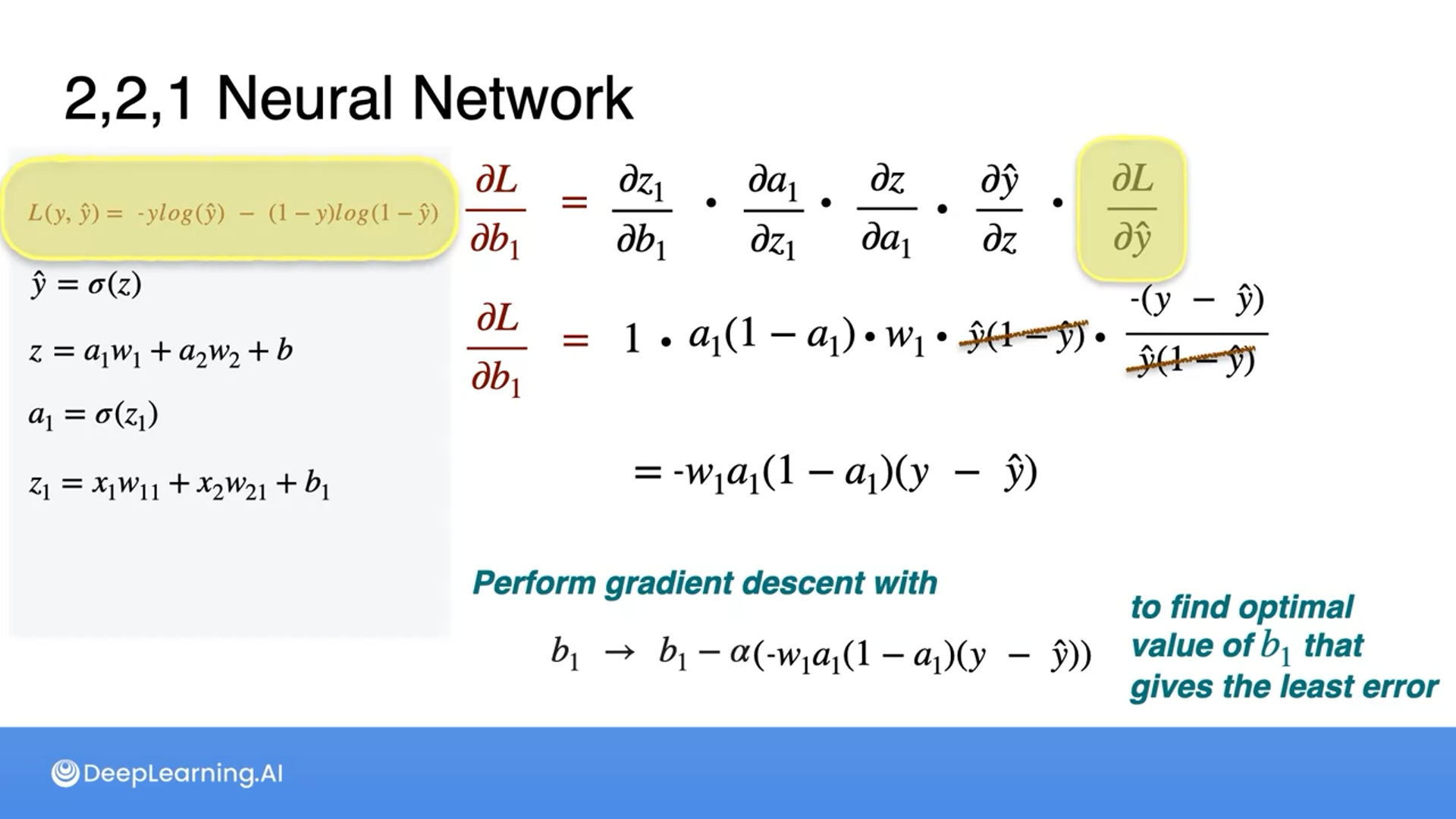 Recall that the derivative of the sigmoid is sigmoid times 1 minus sigmoid, hence replaced with $\hat y$ multiplied by the derivative of the inner part.