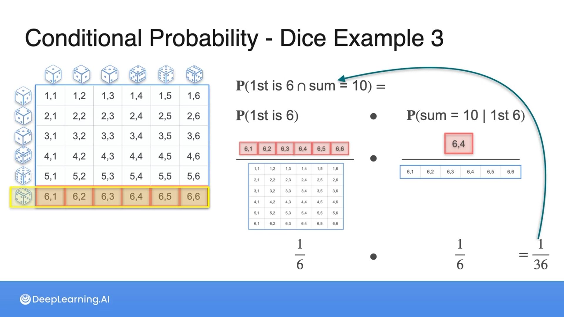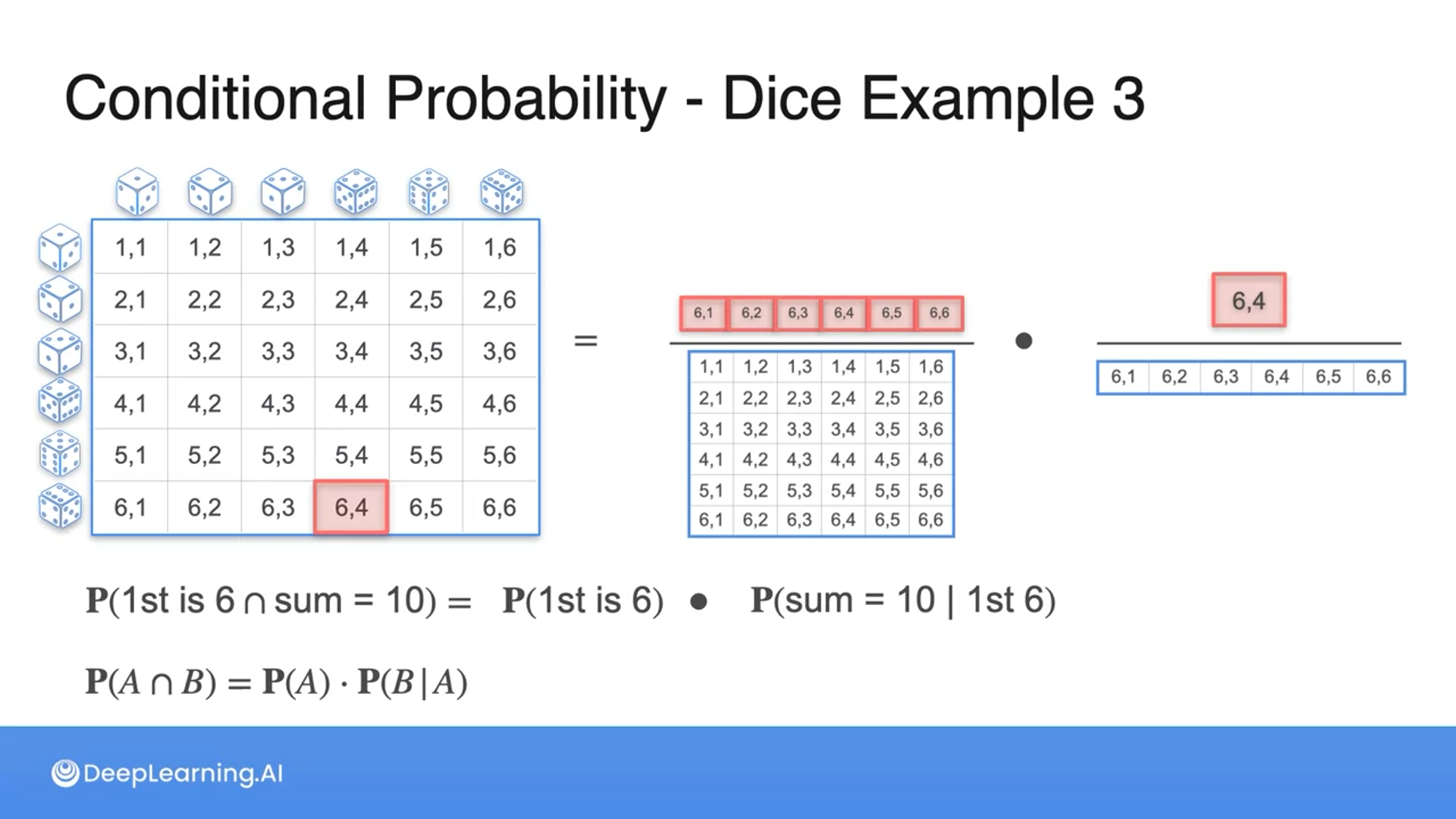 Instead of multiplying two probabilities, we update the second probability to a conditional probability and multiply the two.
