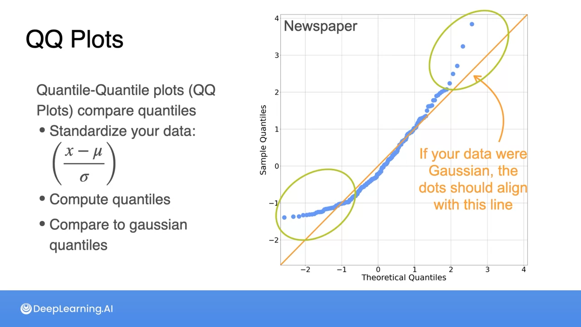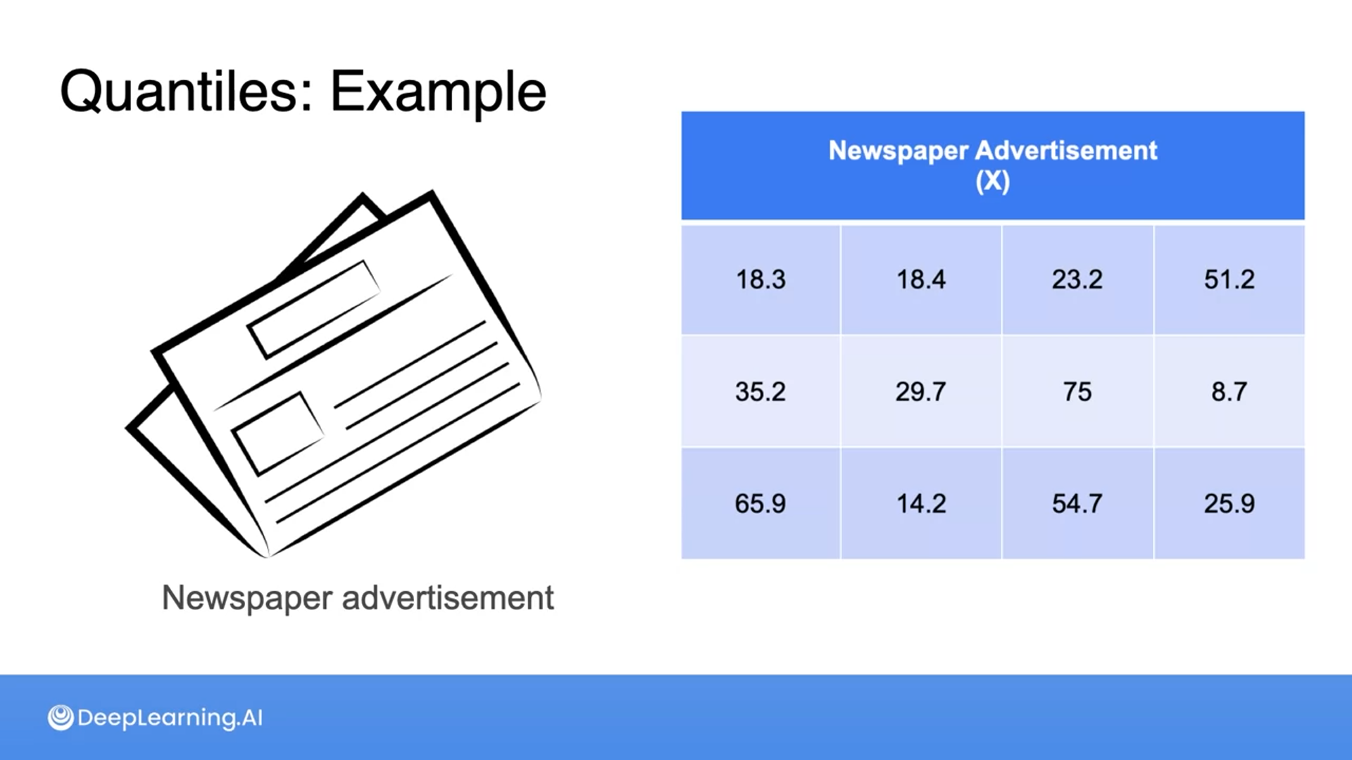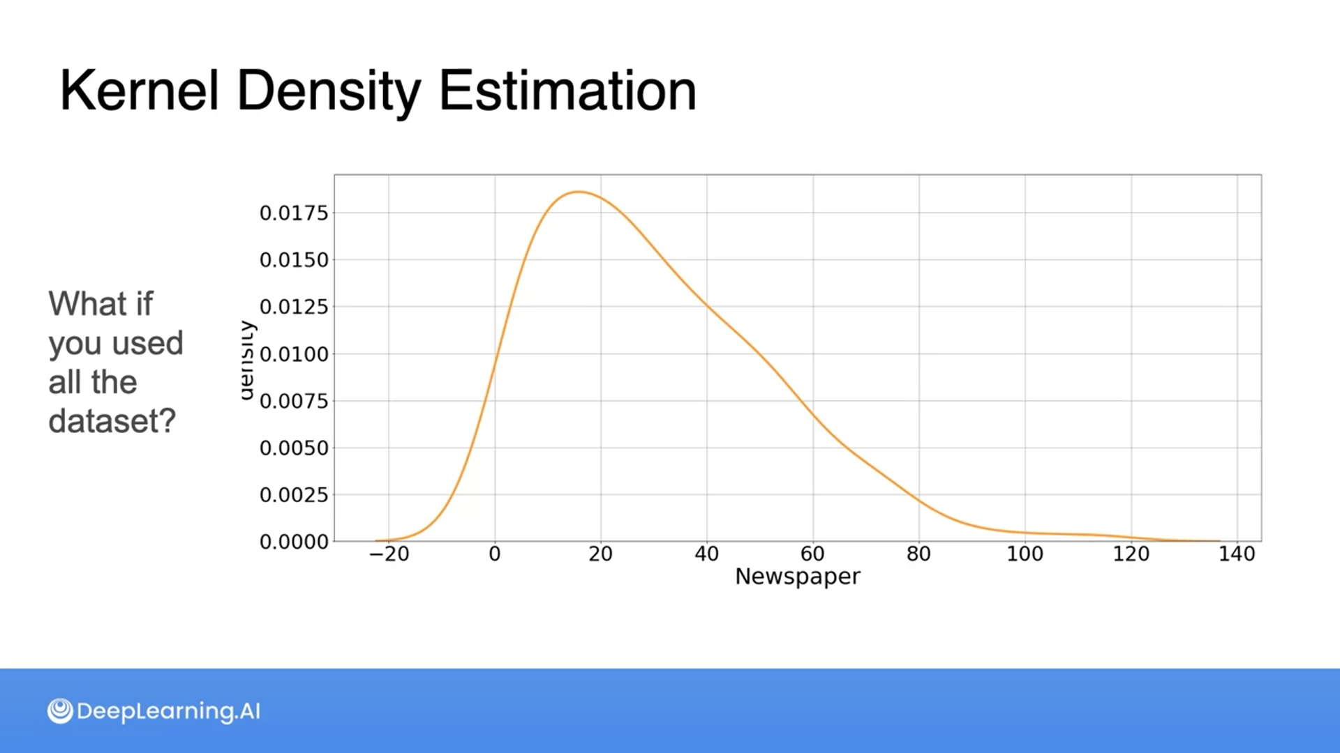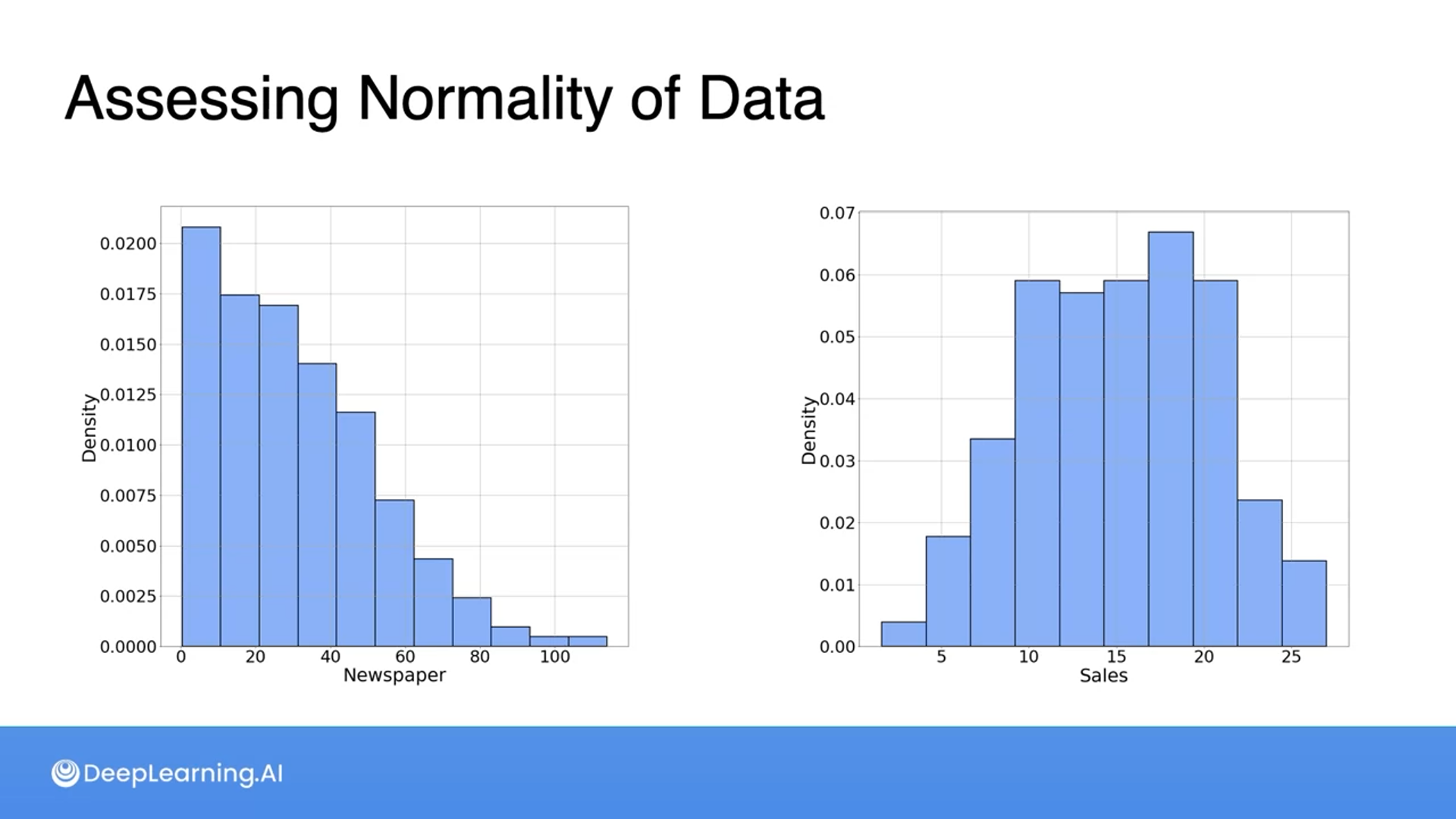 With the example newspaper dataset, we can see that the data doesn’t form a Gaussian distribution, and also more data on the left compared to the right tells us that the dataset is right-skewed.