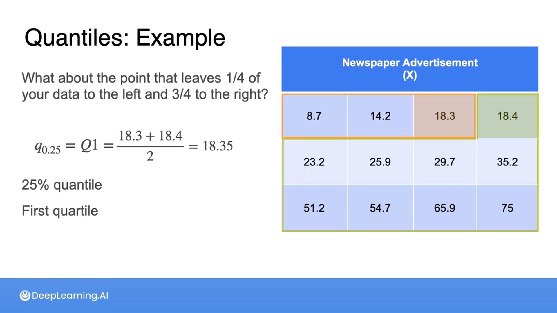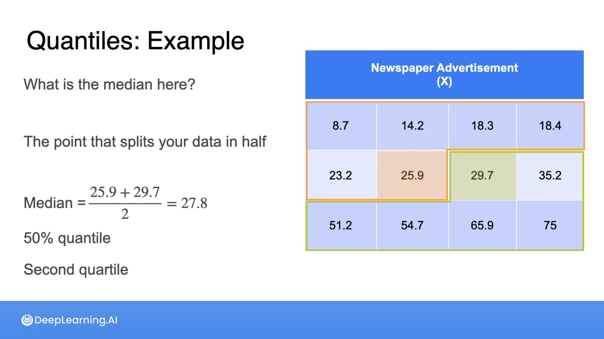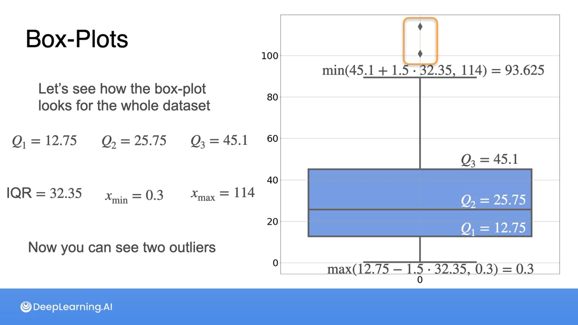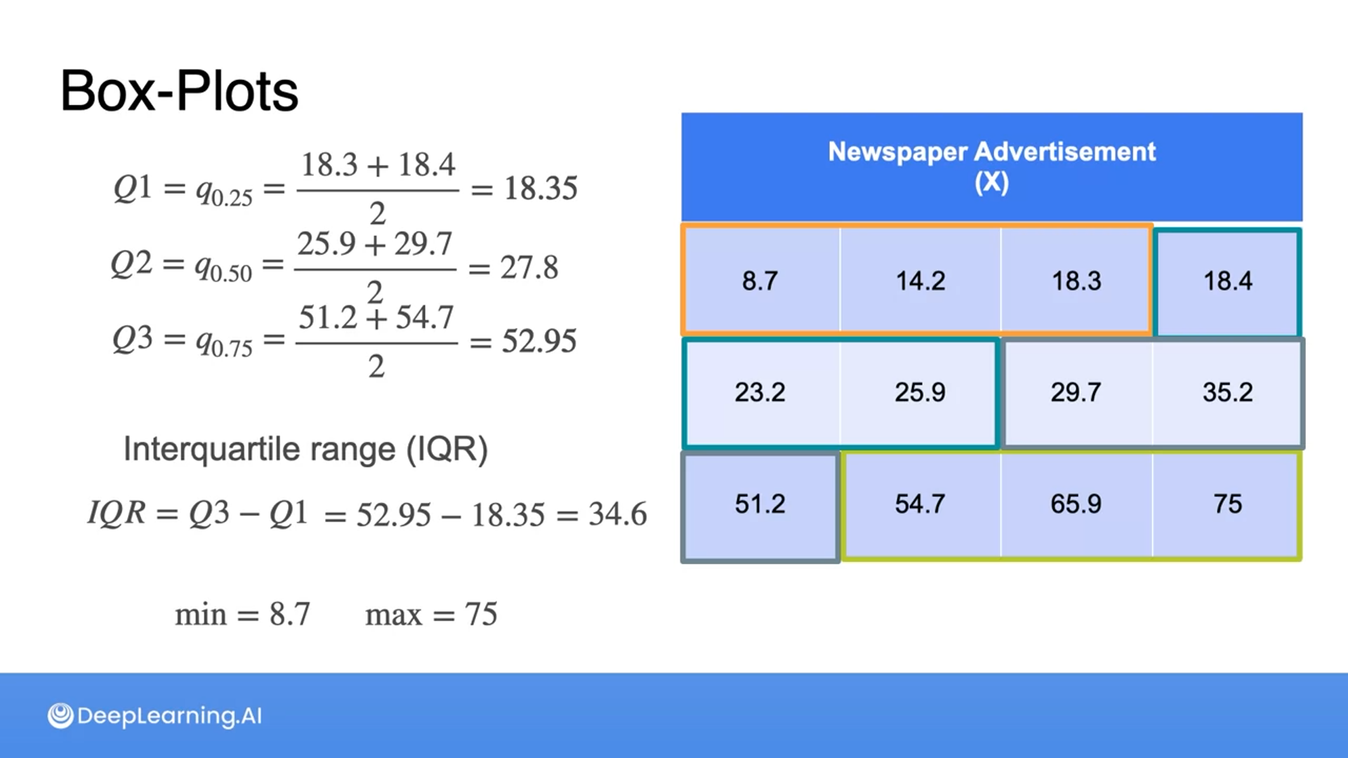 We can visualize the data using the quantiles and we need minimum, maximum, 25%, 50%, and 75% quartiles, and the interquartile range (IQR) which is the third quartile minus the first quartile.