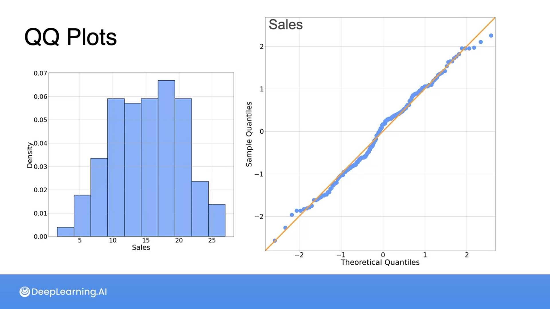 With the sales data, we can see that the data forms a Gaussian distribution by looking at the histograms and QQ plots.