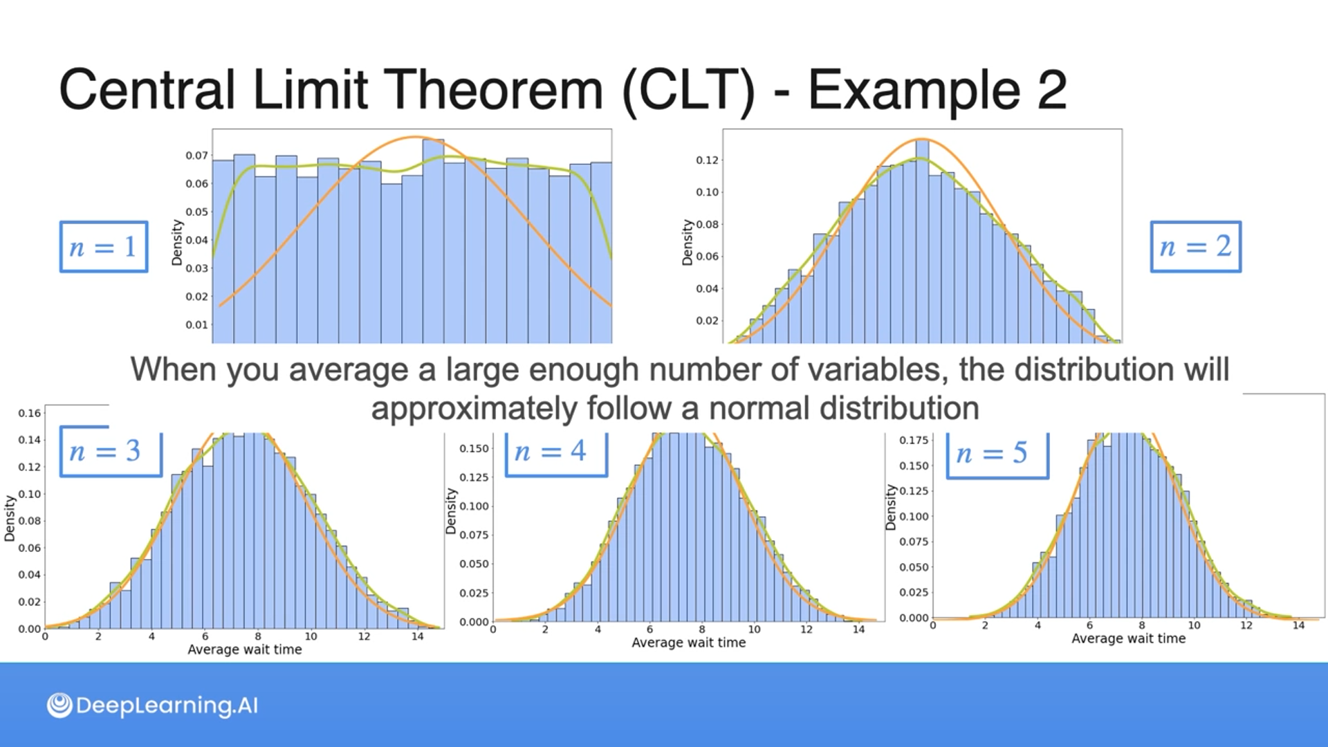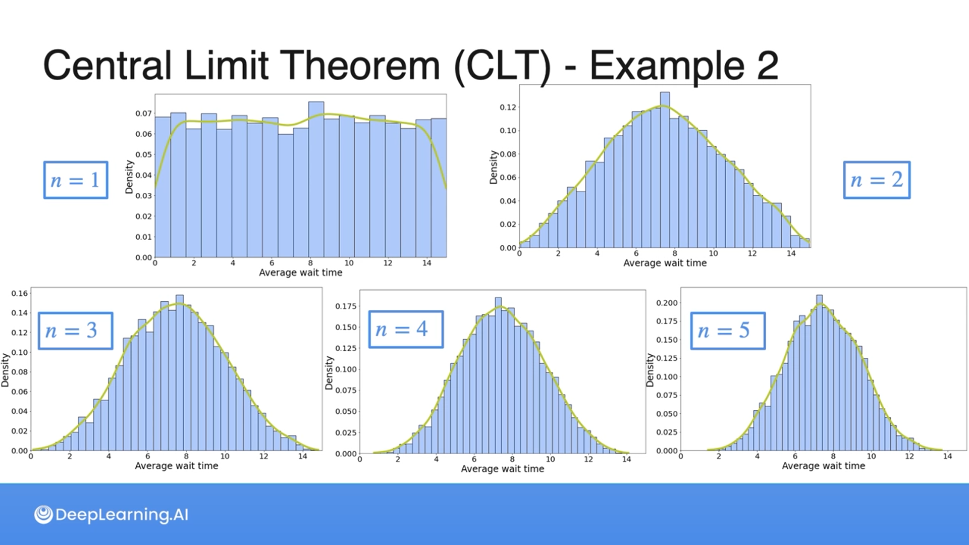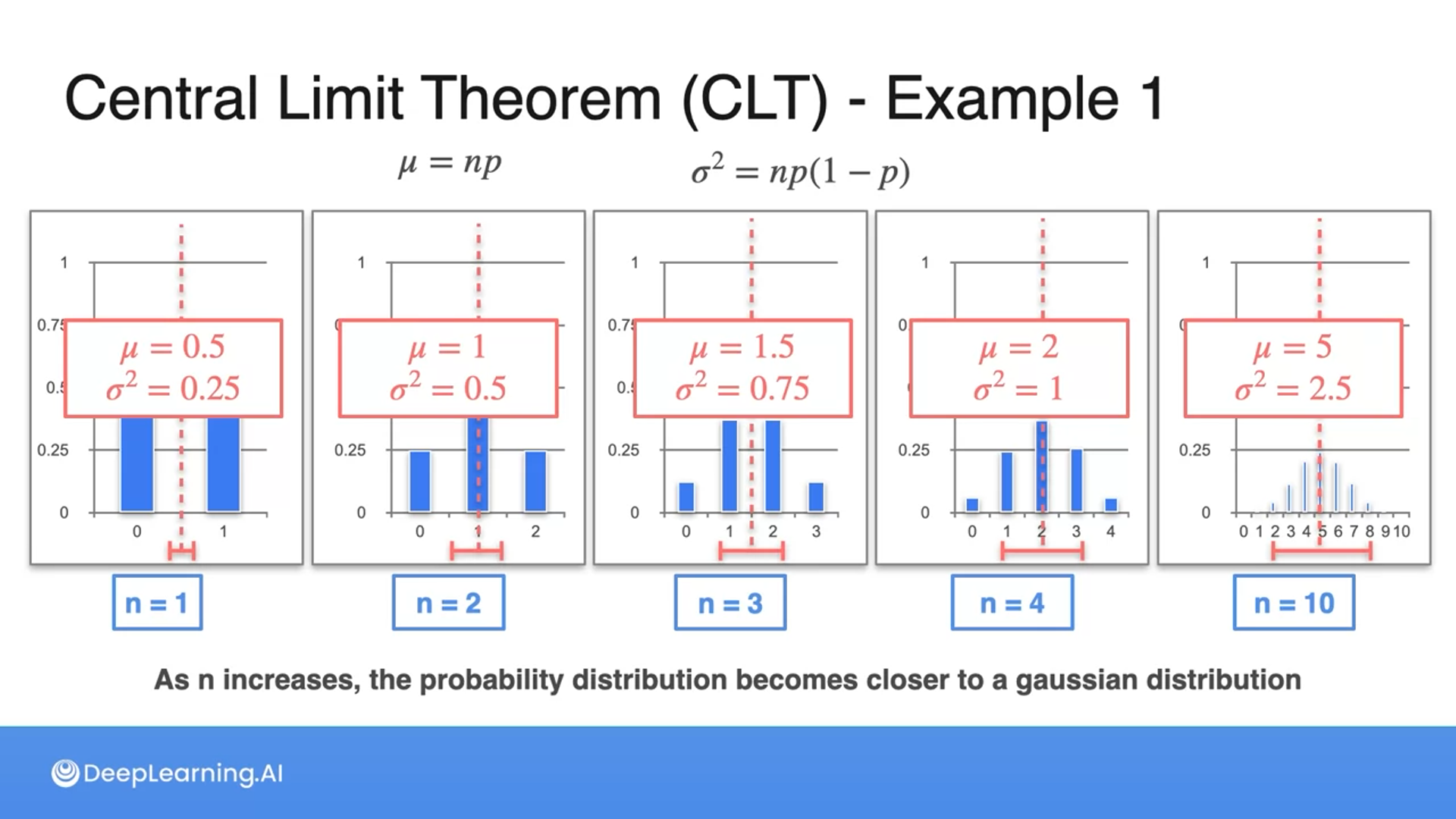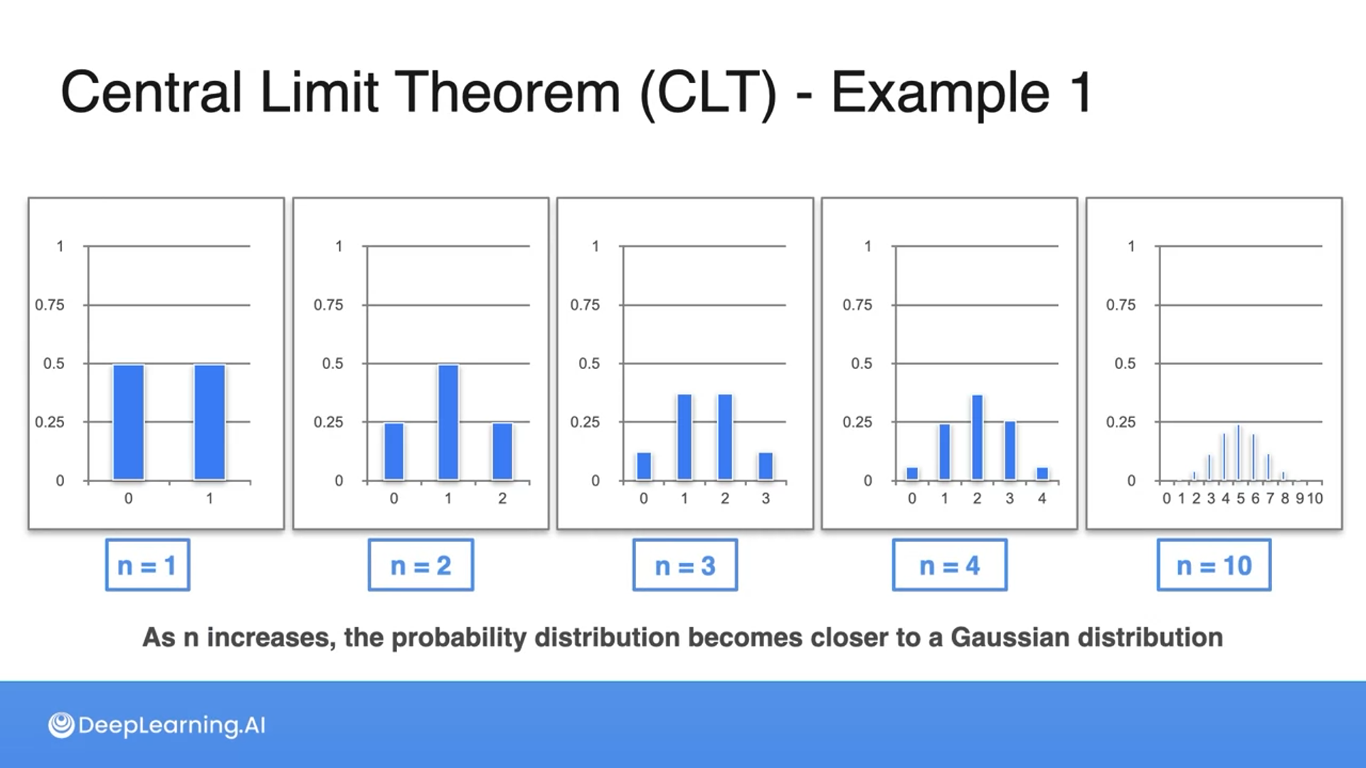 Central Limit Theorem: as n (number of samples) gets larger, the distribution forms more of the Gaussian (normal) distribution.