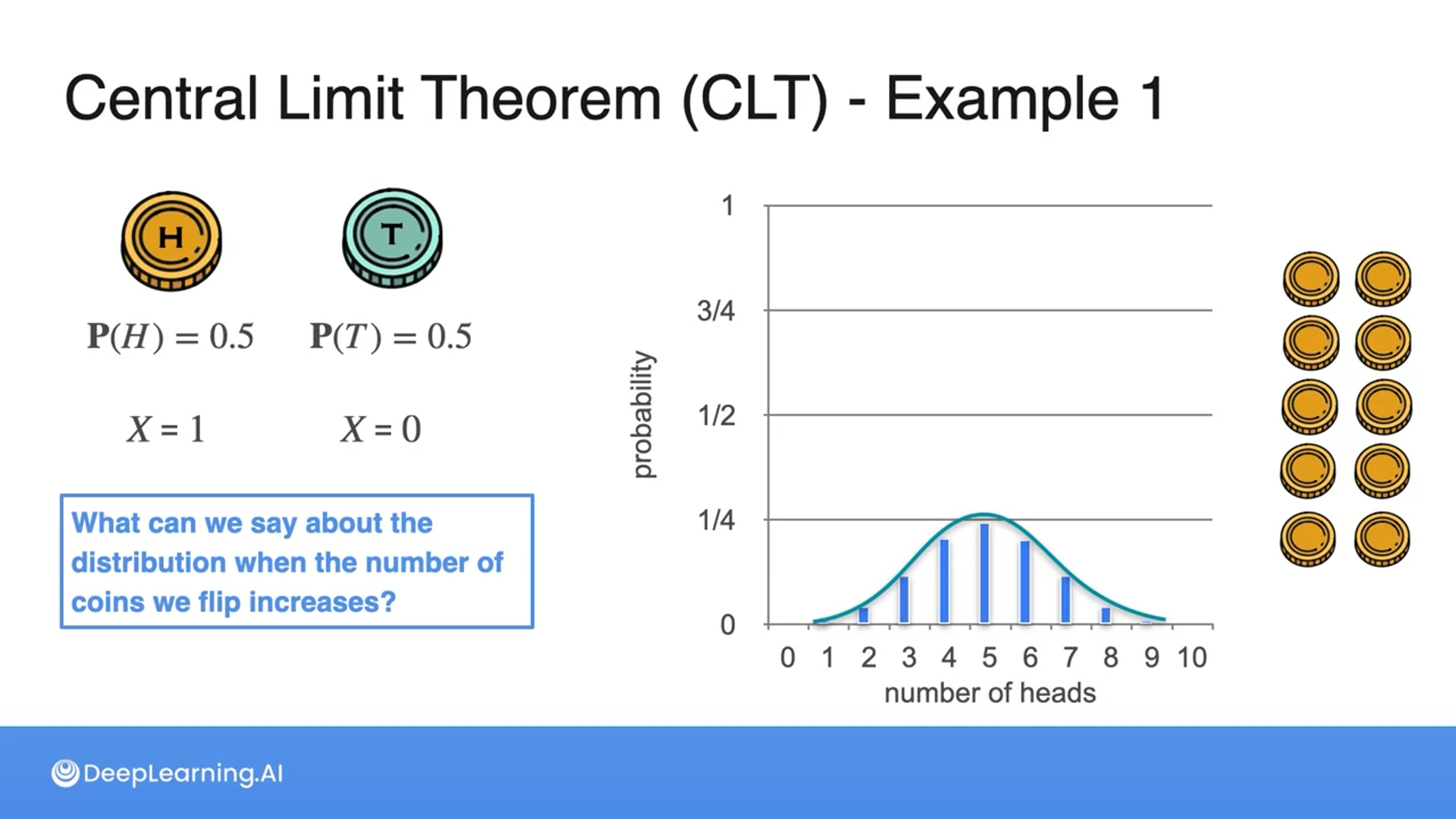 Great job! As the number of coin flips increases, the probability distribution of the number of heads flipped tends to follow a bell-shaped curve, which is characteristic of the normal distribution. Continue the video to hear the explanation.