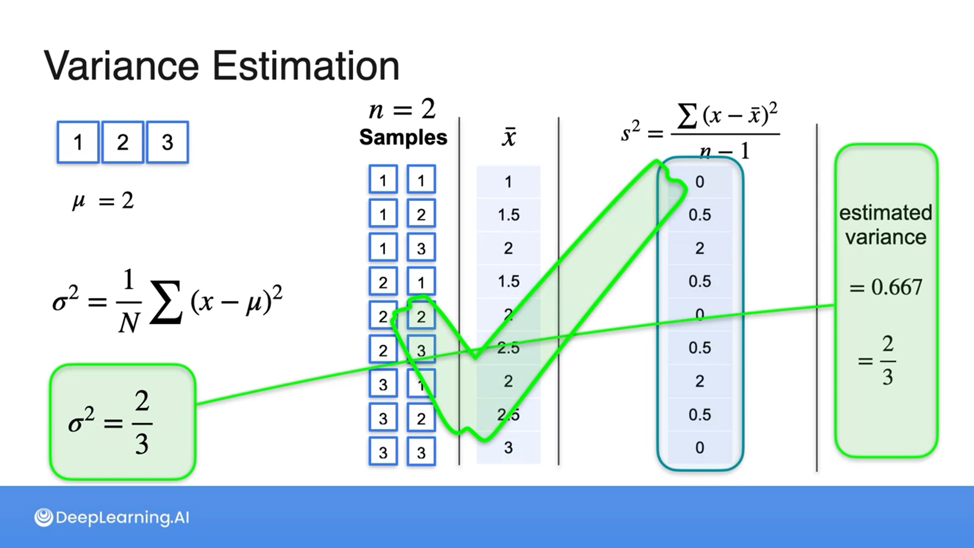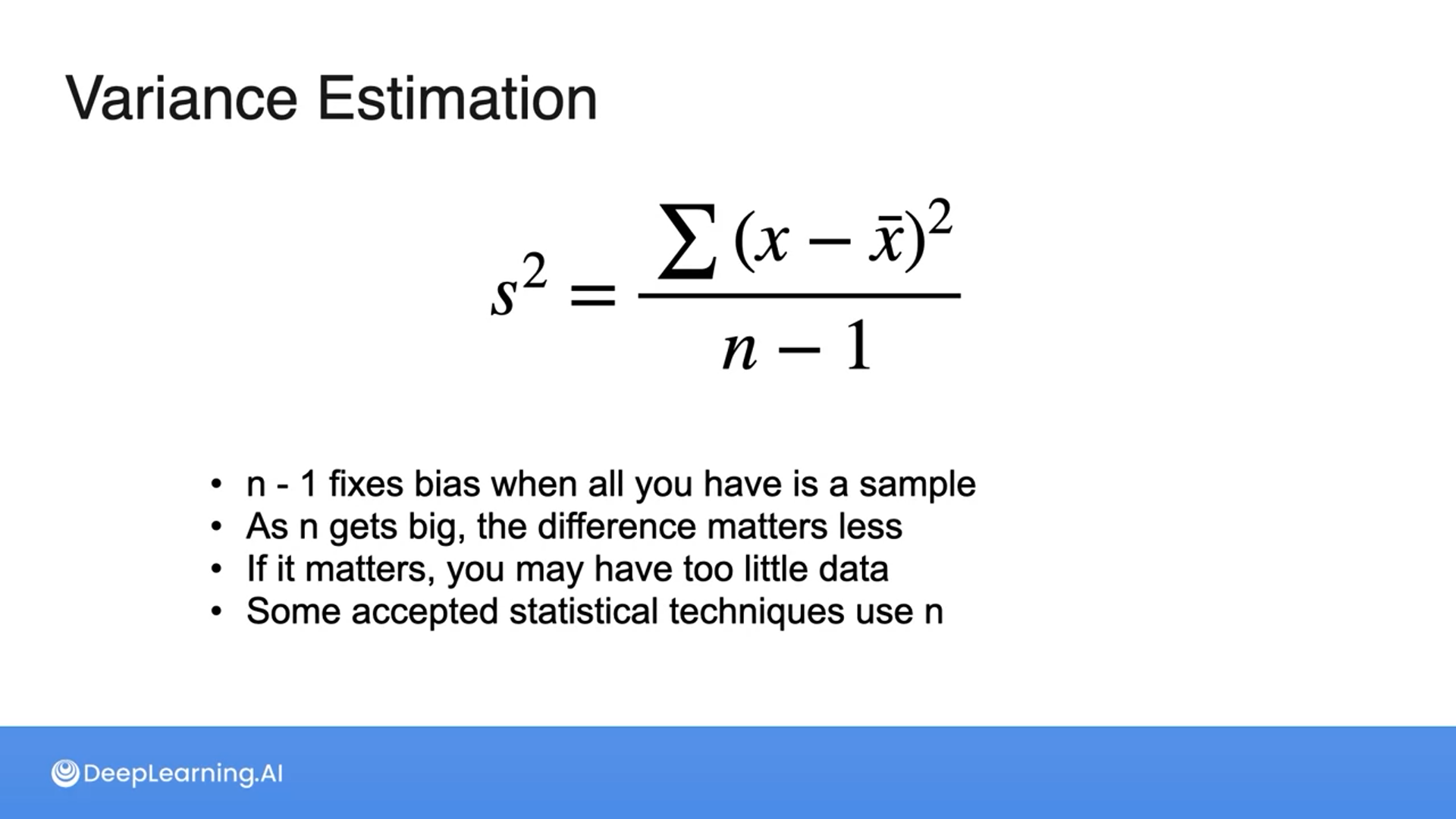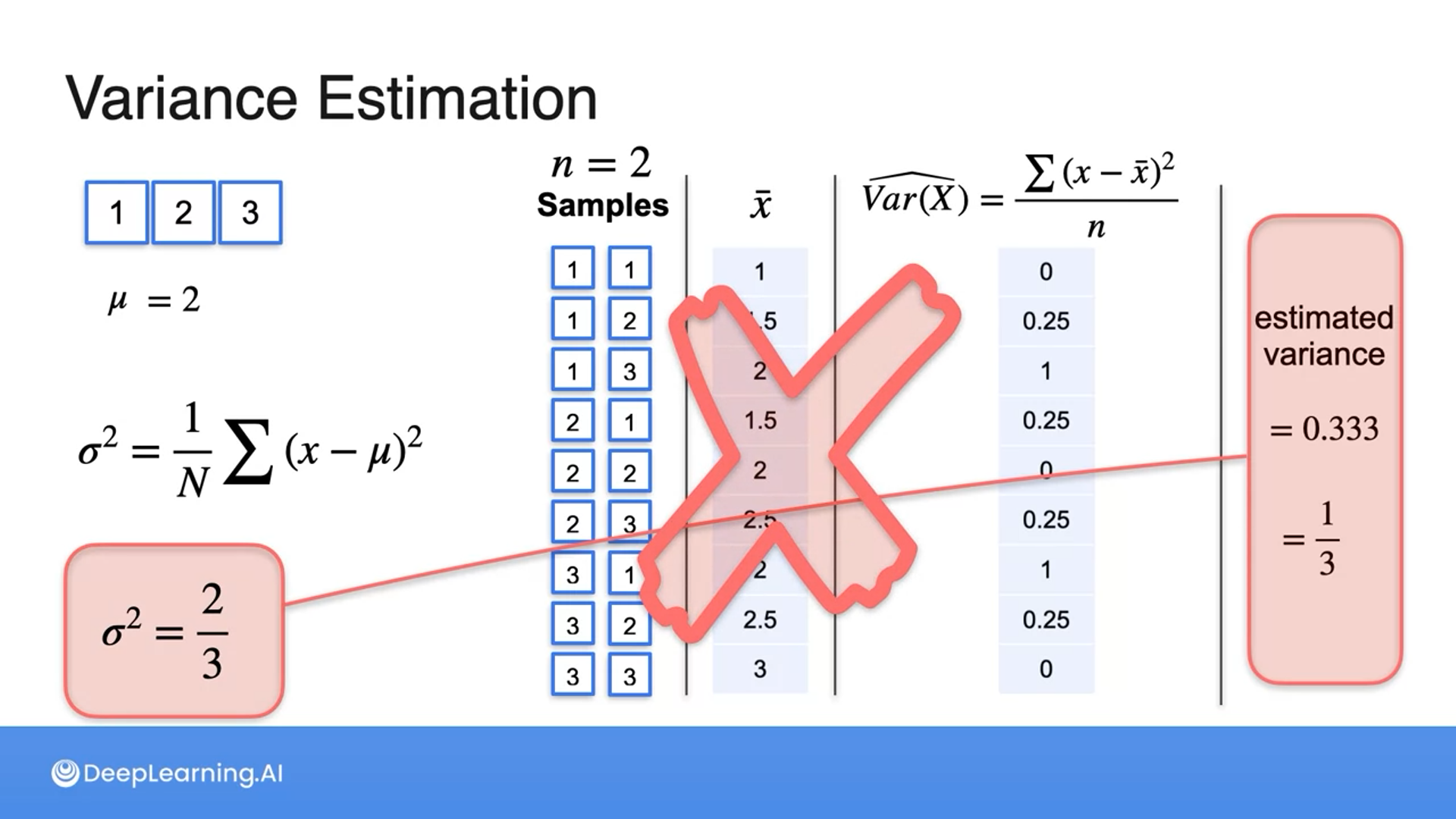 Subtracting the n (number of samples) by 1 in the denominator of the sample variance formula fixes the bias issue that we saw earlier.