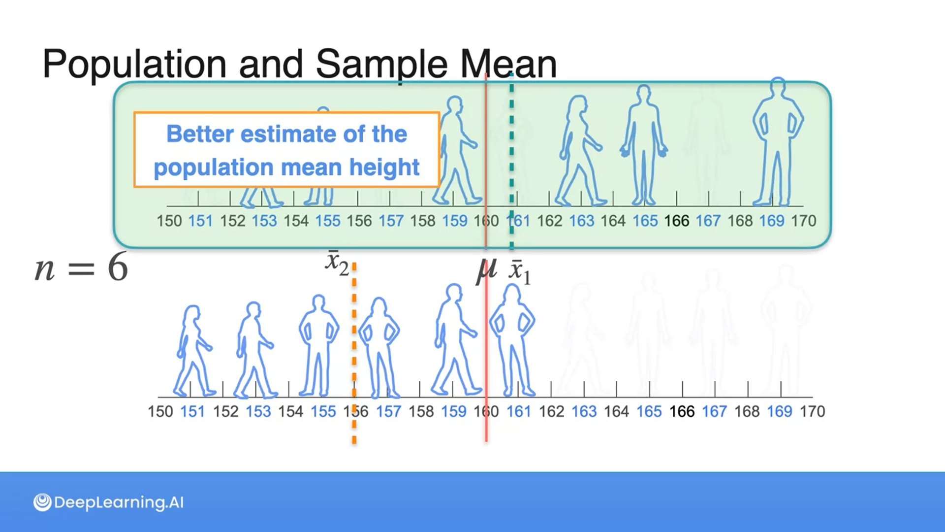 - The mean of a large sample (e.g. sample size = 6) is more likely to represent the population mean.
