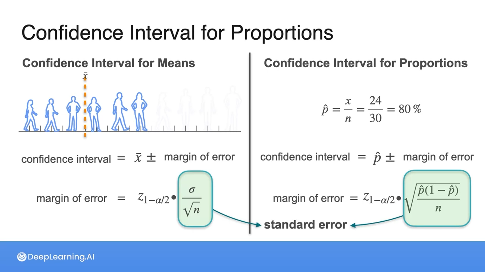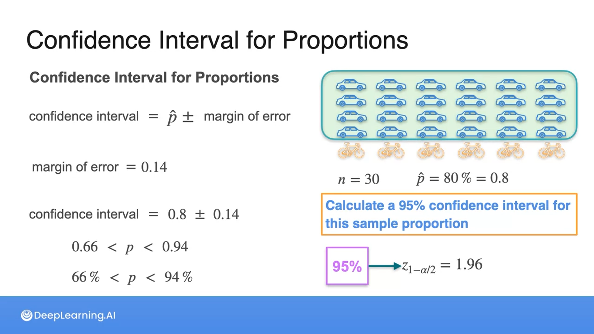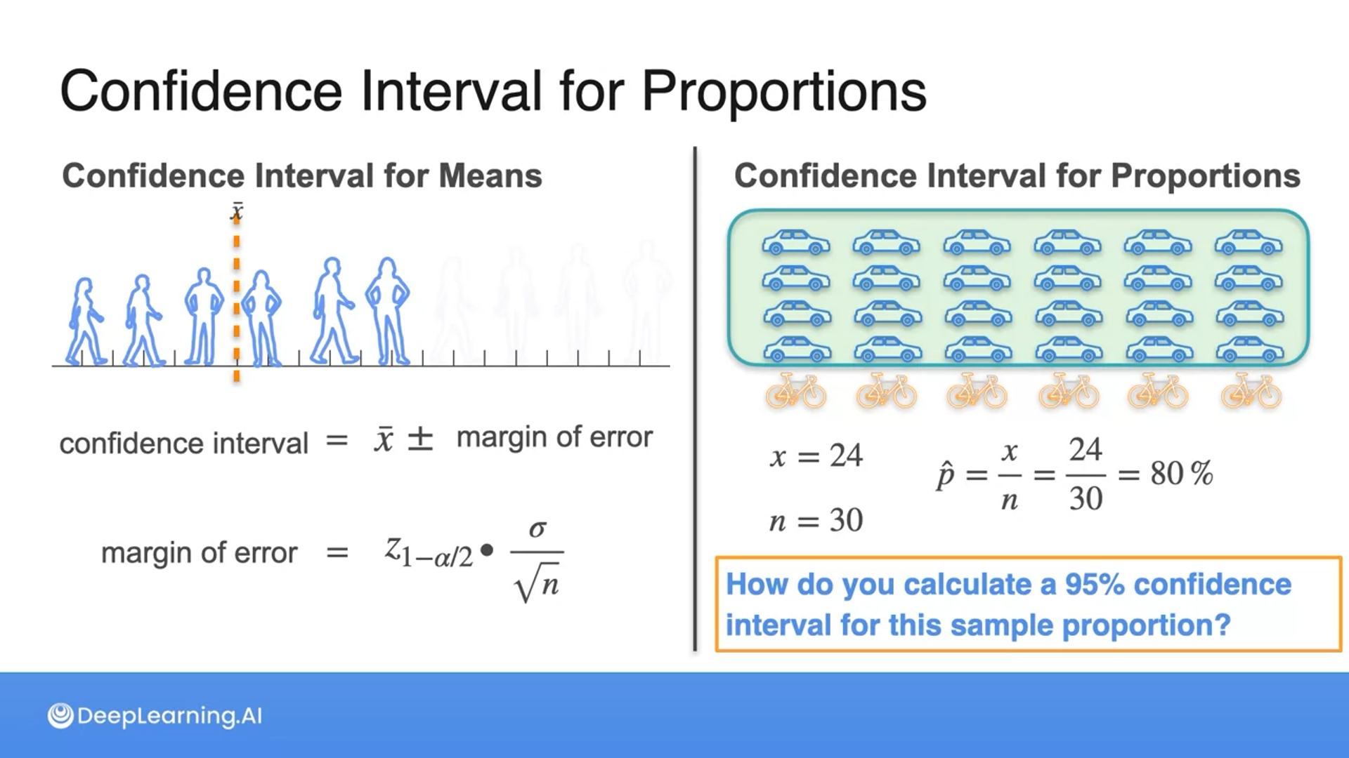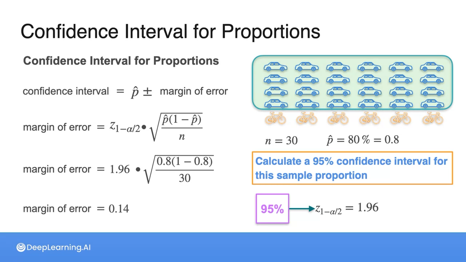 We slightly update the confidence interval formula to compute the confidence interval for the proportion.