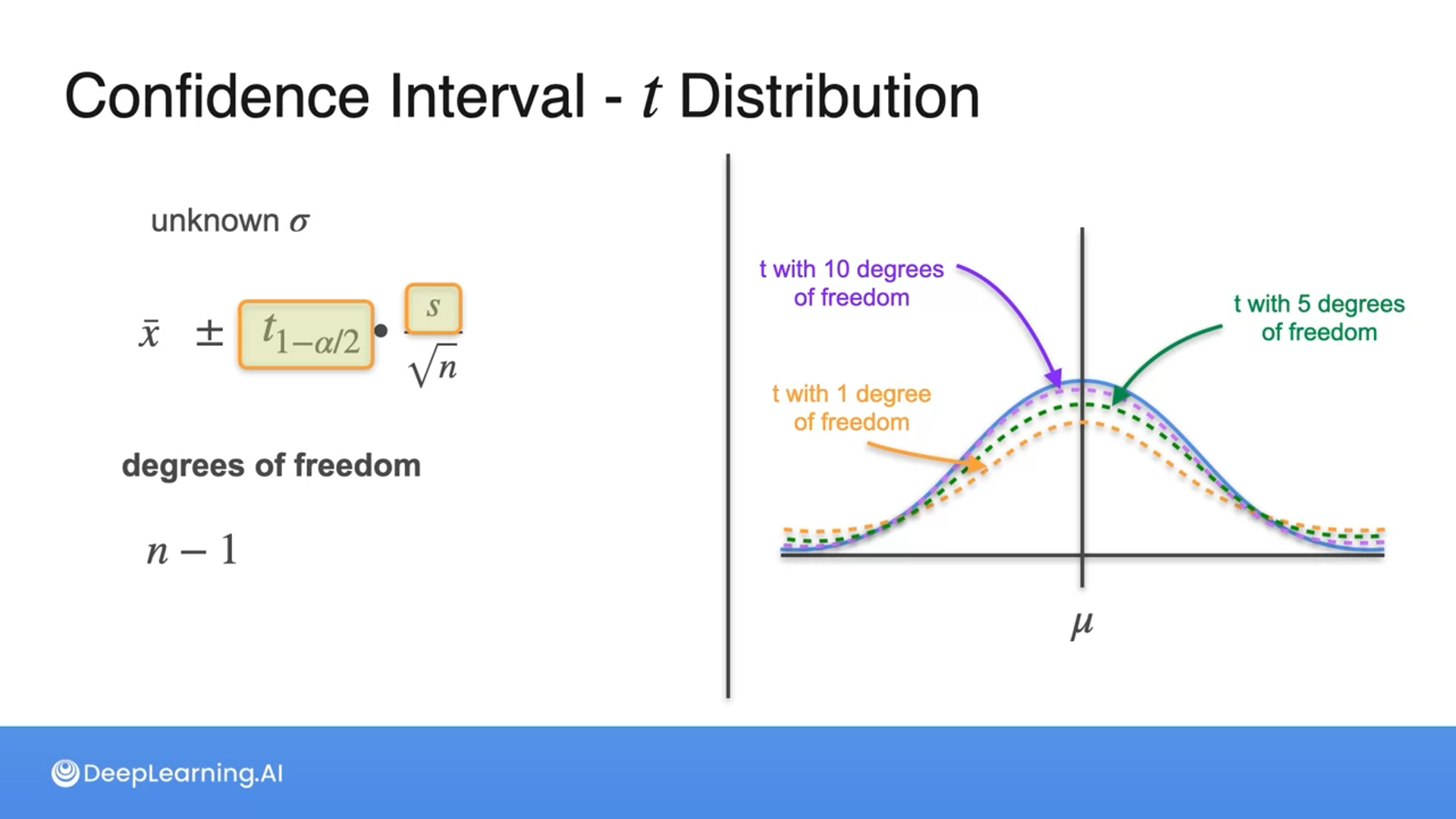 Without knowing the population standard deviation like the previous examples, we use the sample standard deviation and construct the student’s t distribution to get the confidence interval.