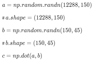 Recall that $np.dot(a, b)$performs a matrix multiplication on $a$ and $b$, whereas $a ∗ b$ performs an element-wise multiplication. Consider the two following random arrays $a$ and $b$: