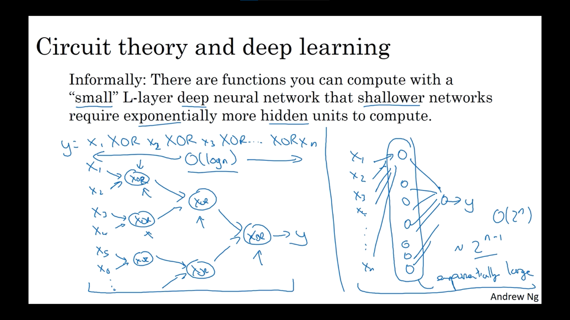 Typically with the results of the circuit theory, using XOR as neurons to compute a function, deep neural networks need fewer hidden units compared to shallow neural networks where more hidden units are needed to compute the same function.