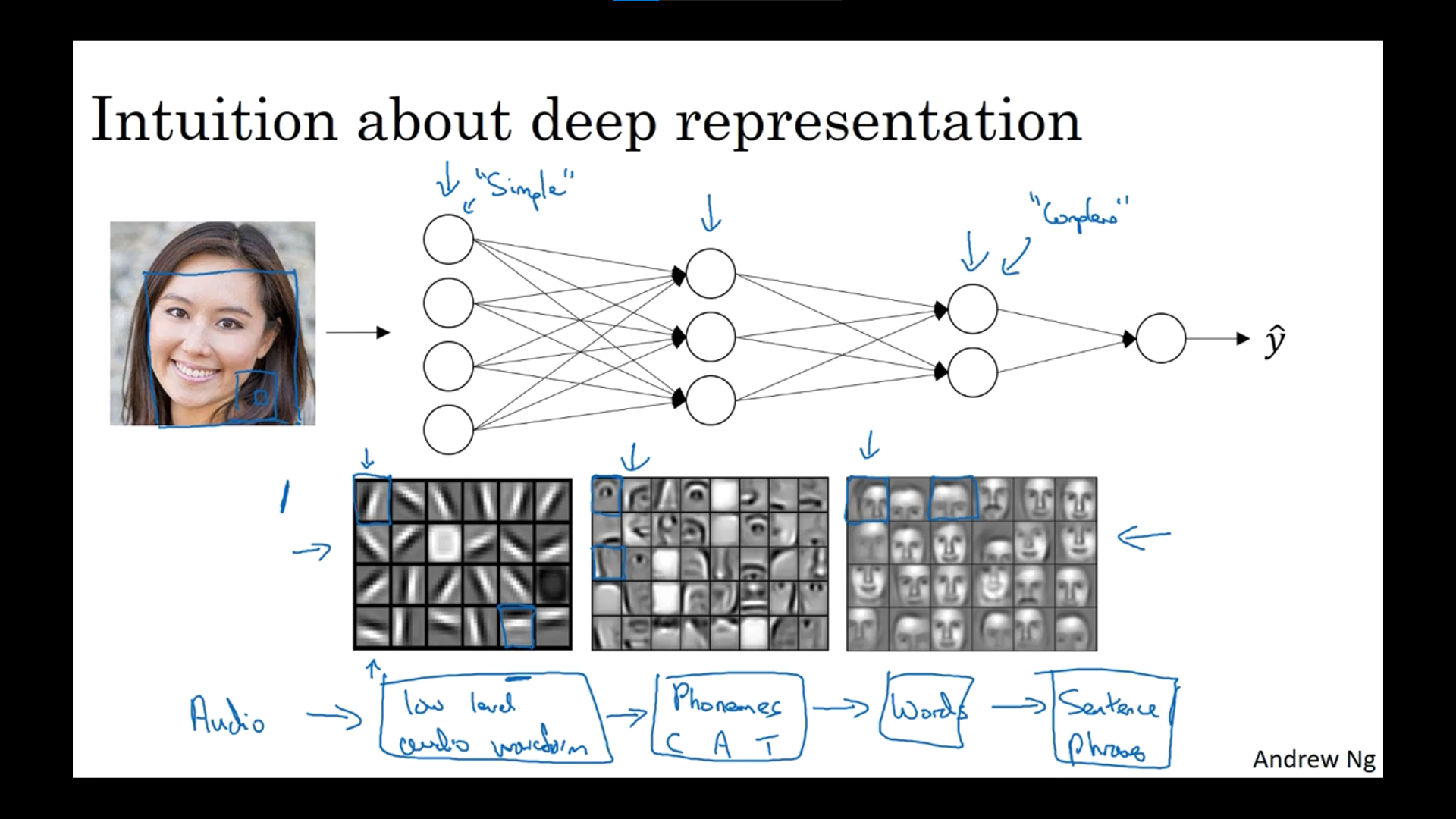 The earlier layers of the neural networks detect low-level (basic) features like edges and later layers detect high-level (complex) features like faces or whole images.