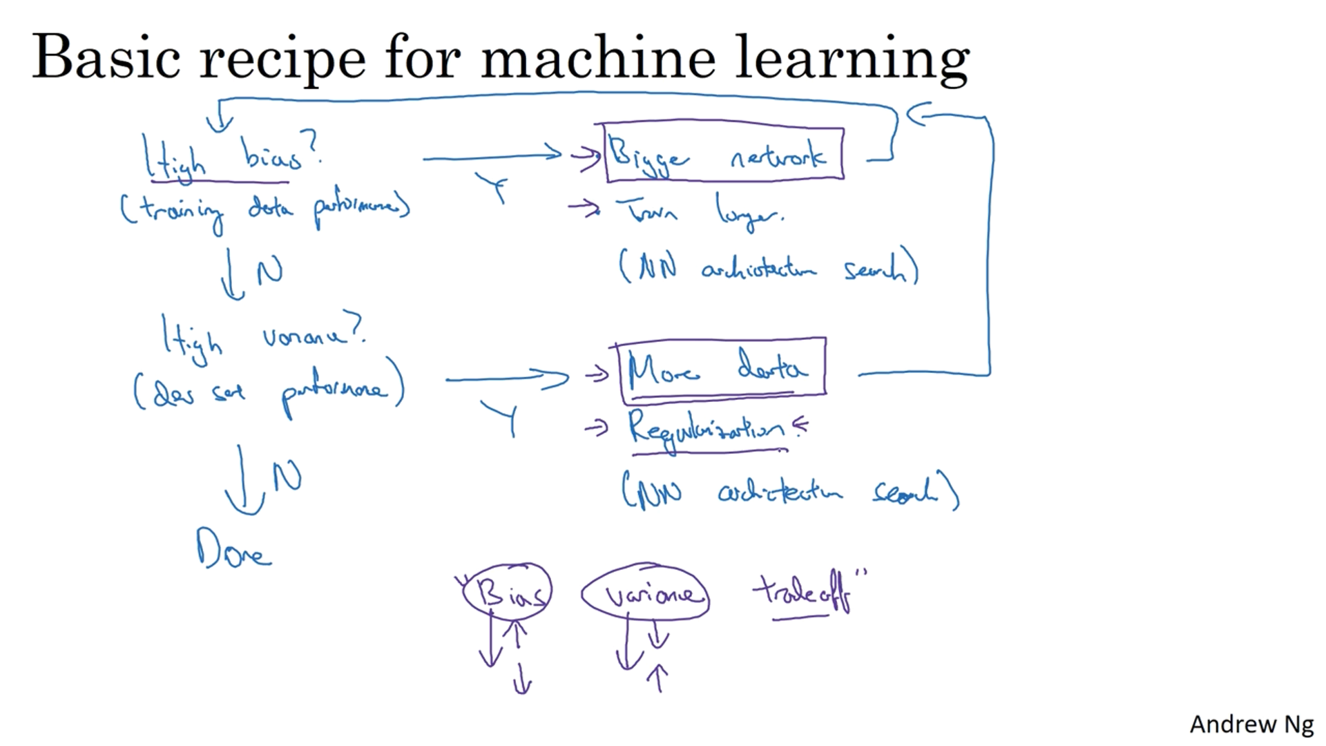 Once high bias is reduced, check for variance, and if high variance (dev set performance):