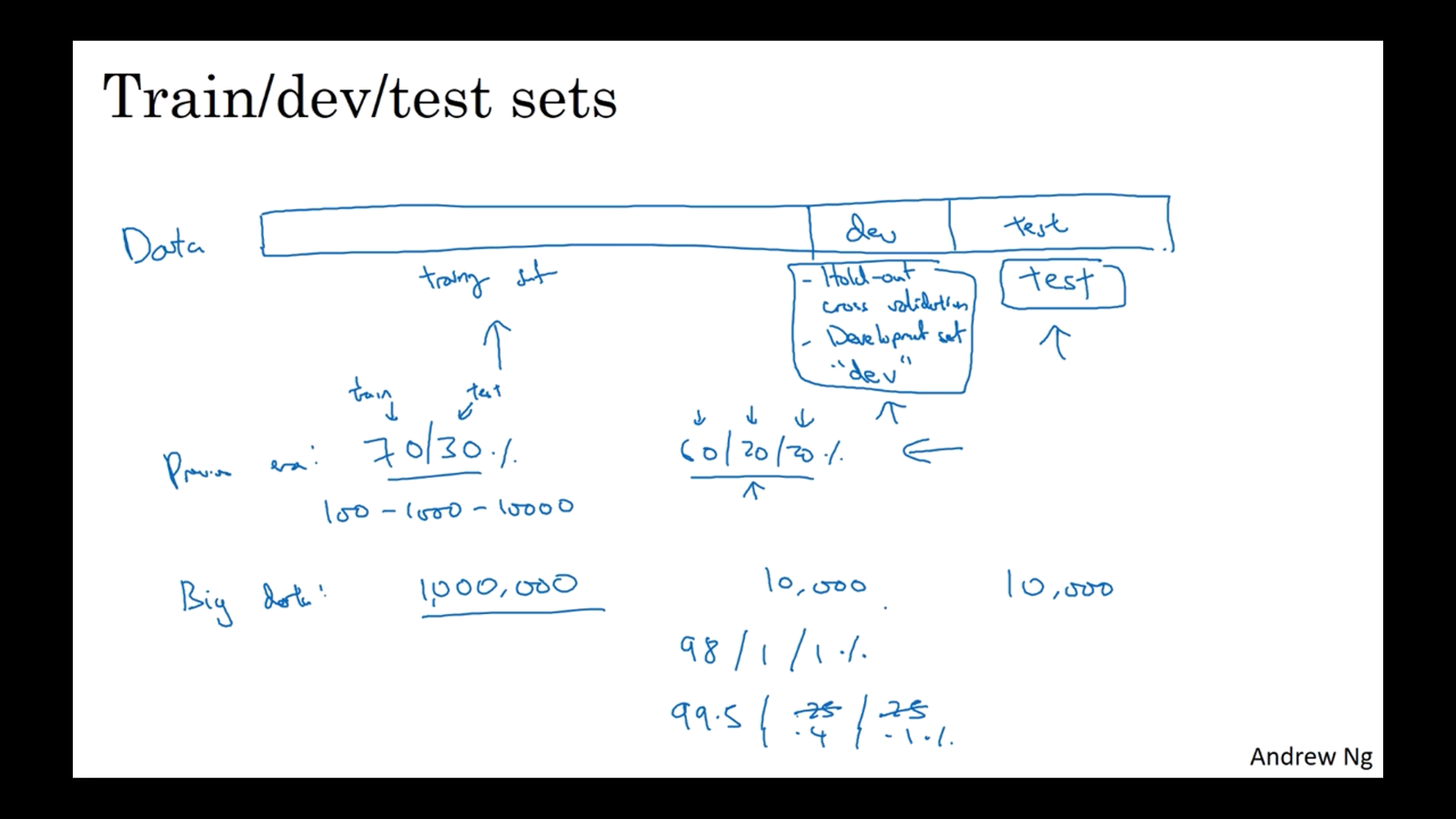 Small data: Traditionally 60/20/20 was used to split the data (100 ~ 10,000 data)
