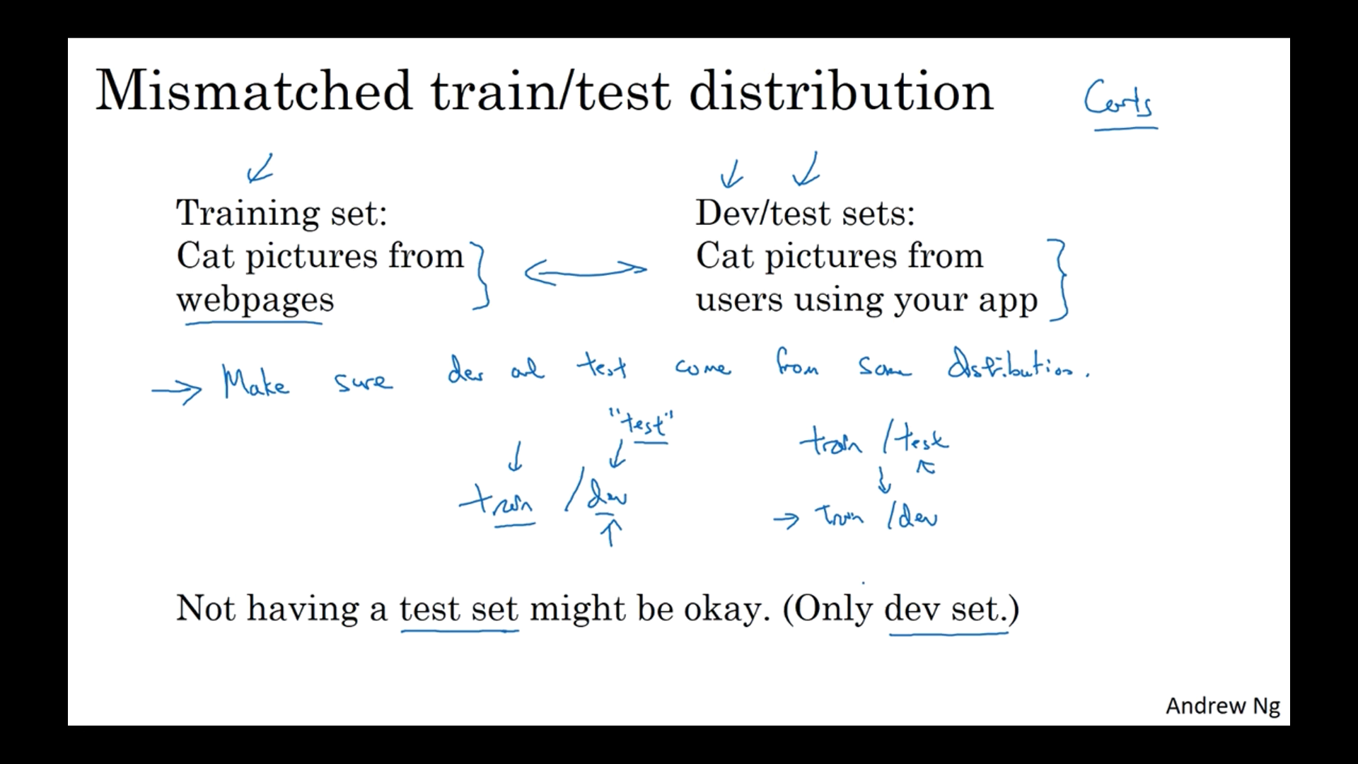 - The training set doesn’t necessarily have to follow the same distribution as the dev/test sets, since the training set hungers for data