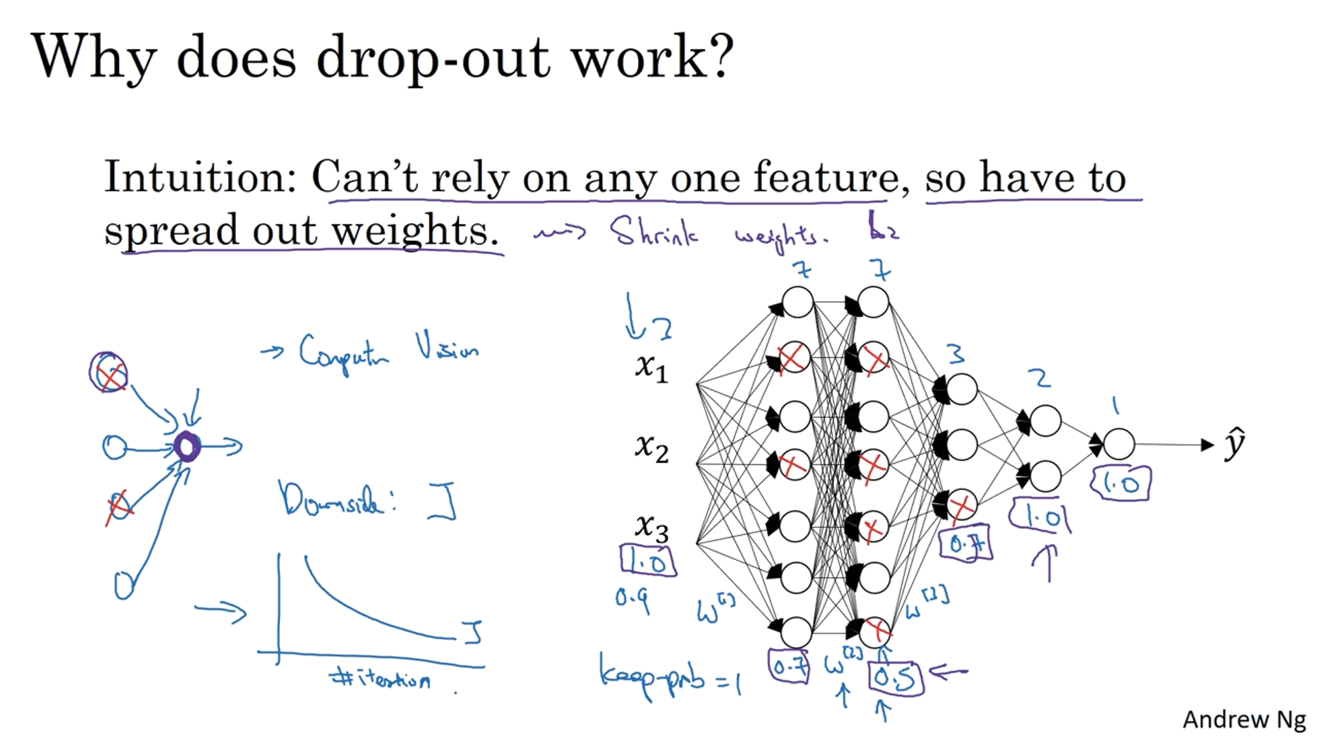 - So run the code without dropout (set keep_prob = 1) and check $J$ by plotting it, then apply dropout to reduce the variance