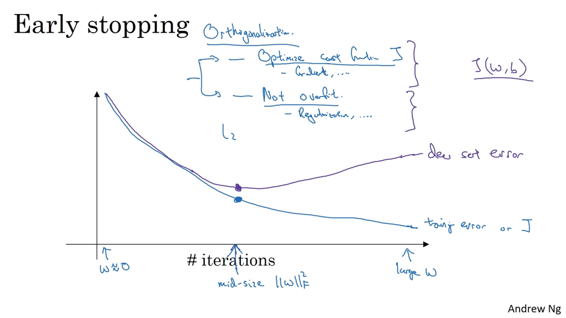 The downside of early stopping is that one is using one tool to solve two different problems (optimize cost function $J$ and not overfit)
