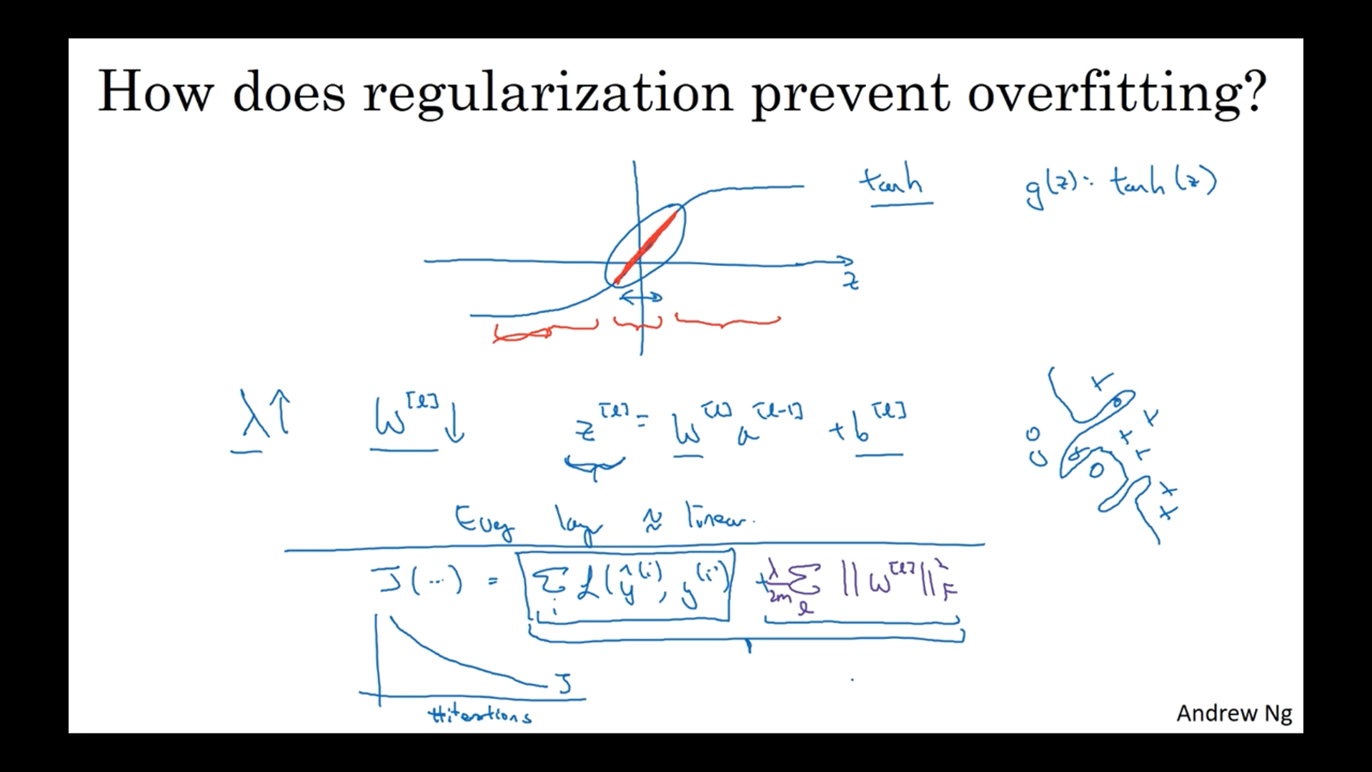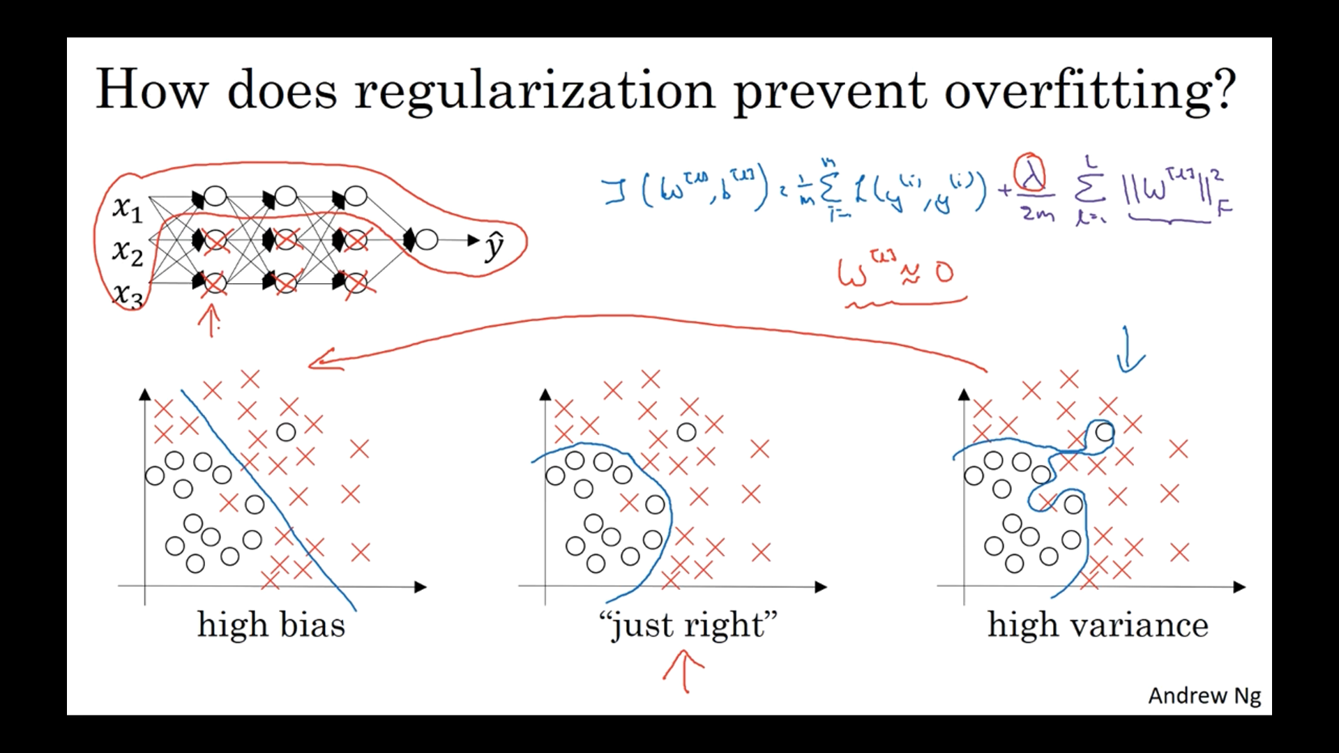 If $\lambda$ is big, the weights will get close to zero, so we are simplifying the neural network (zeroing out the impact of several hidden units).