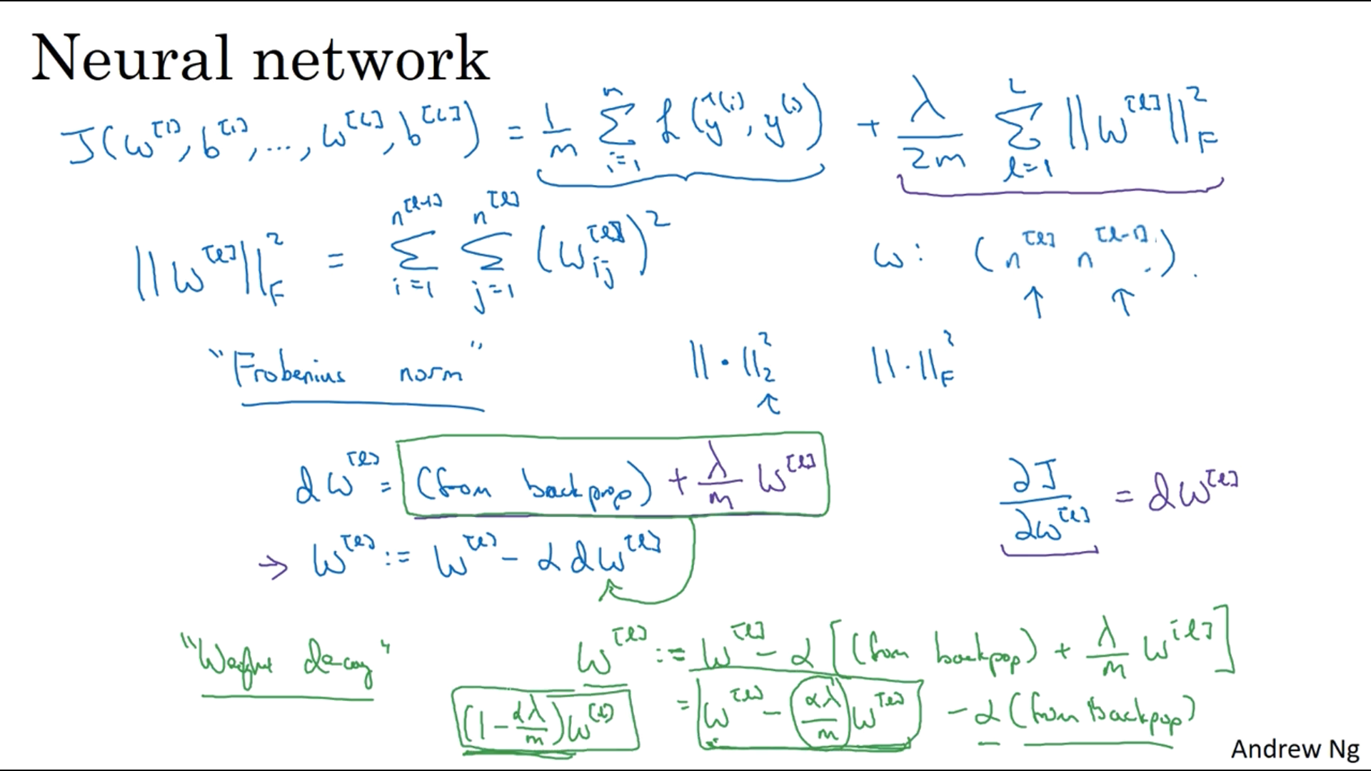 $∣∣w^{[l]}∣∣^2=∑_{i=1}^{n^{[l]}}∑_{j=1}^{n^{[l−1]}}(w_{i,j}^{[l]})^2$