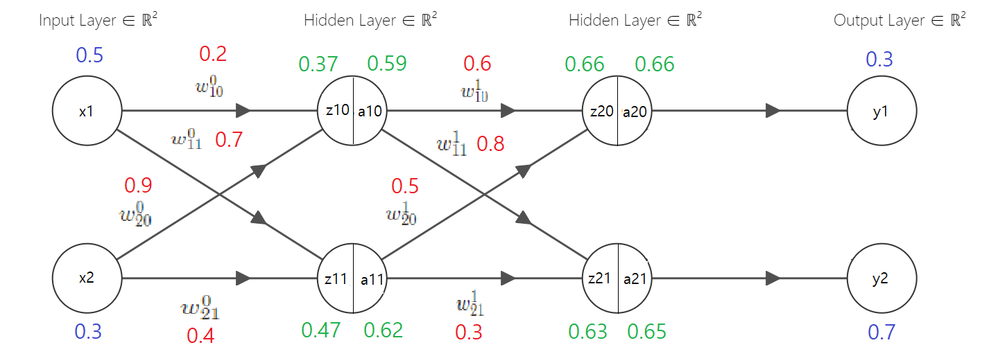순전파로 값들을 다 도출했으니 이제 역전파로 오차에 대한 변화량을 찾을 차례이다