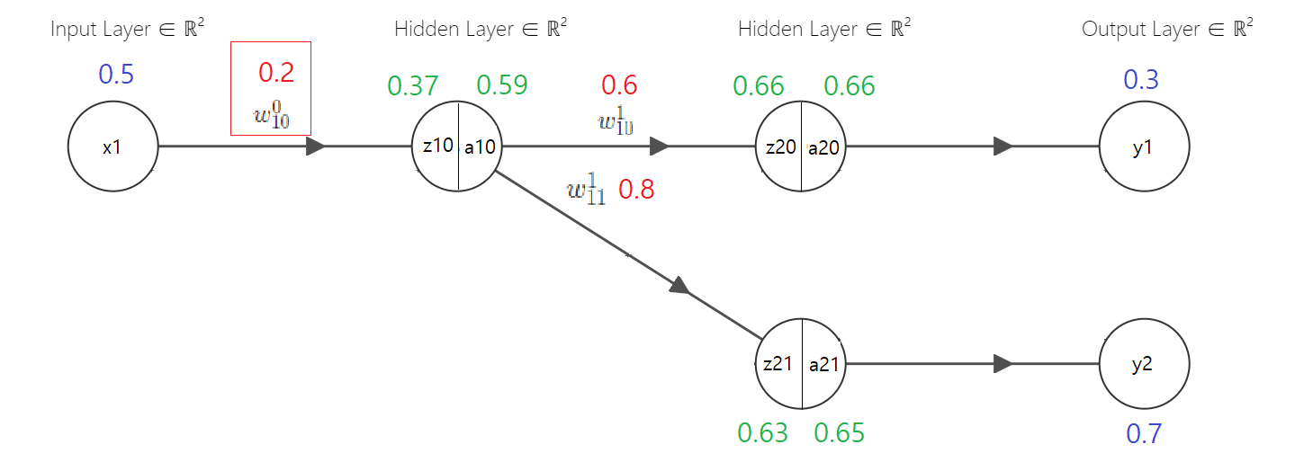 위 예제 그림 중 역전파를 이용해 $w^1_{10}$을 계산해 보자
